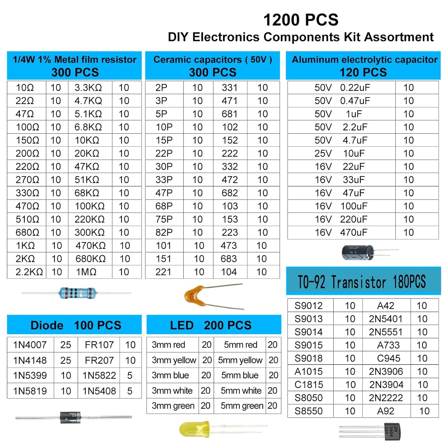 1200PCS Basic Electronics Component Assortment Kit Basic Electronics Component Kit,Ceramic Capacitor,Aluminum Electrolytic