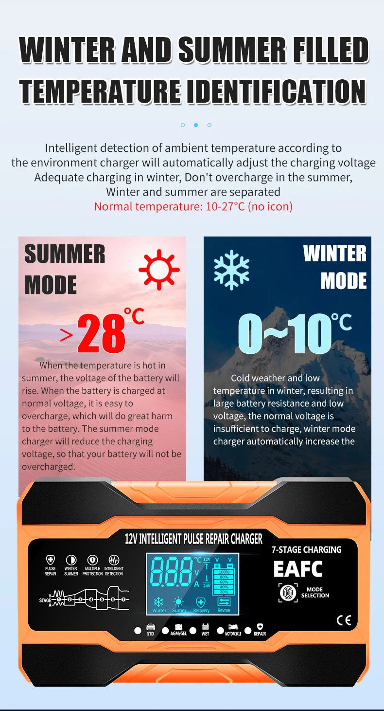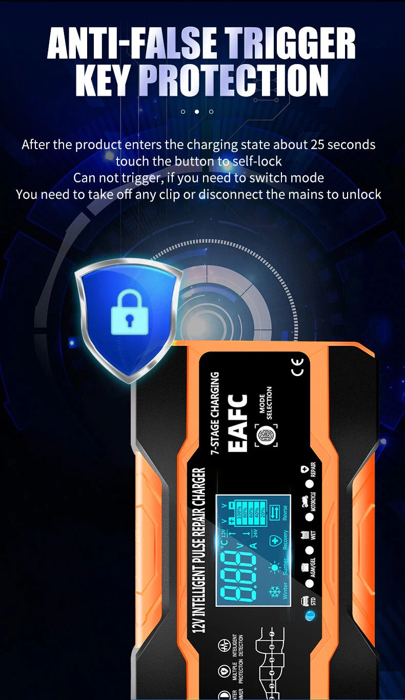 12V 24V 12A 10A Battery Charger Smart Fast Charging for Car Batteries 7-Stage Charge Pulse Repair for AGM GEL WET Lead Acid