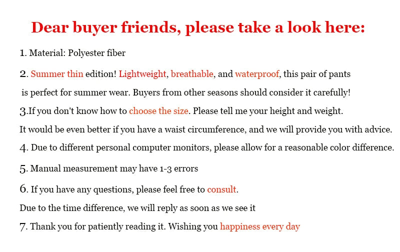 Note 1: Summer pants,lightweight, breathable and waterproof
