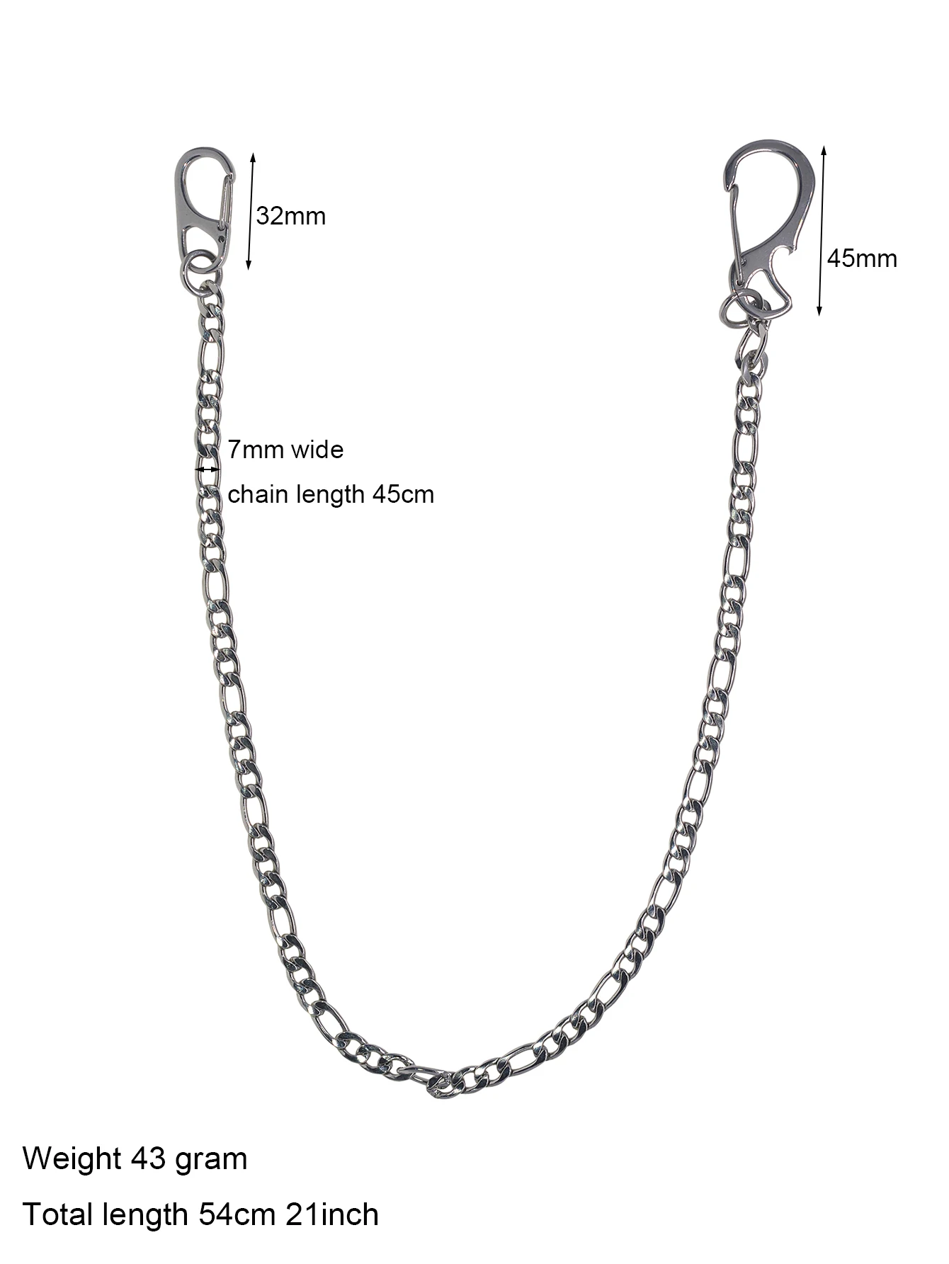 21 inch long Figaro 3:1 chain necklace choker jean trouses chain street dance decor stainless steel carabiners