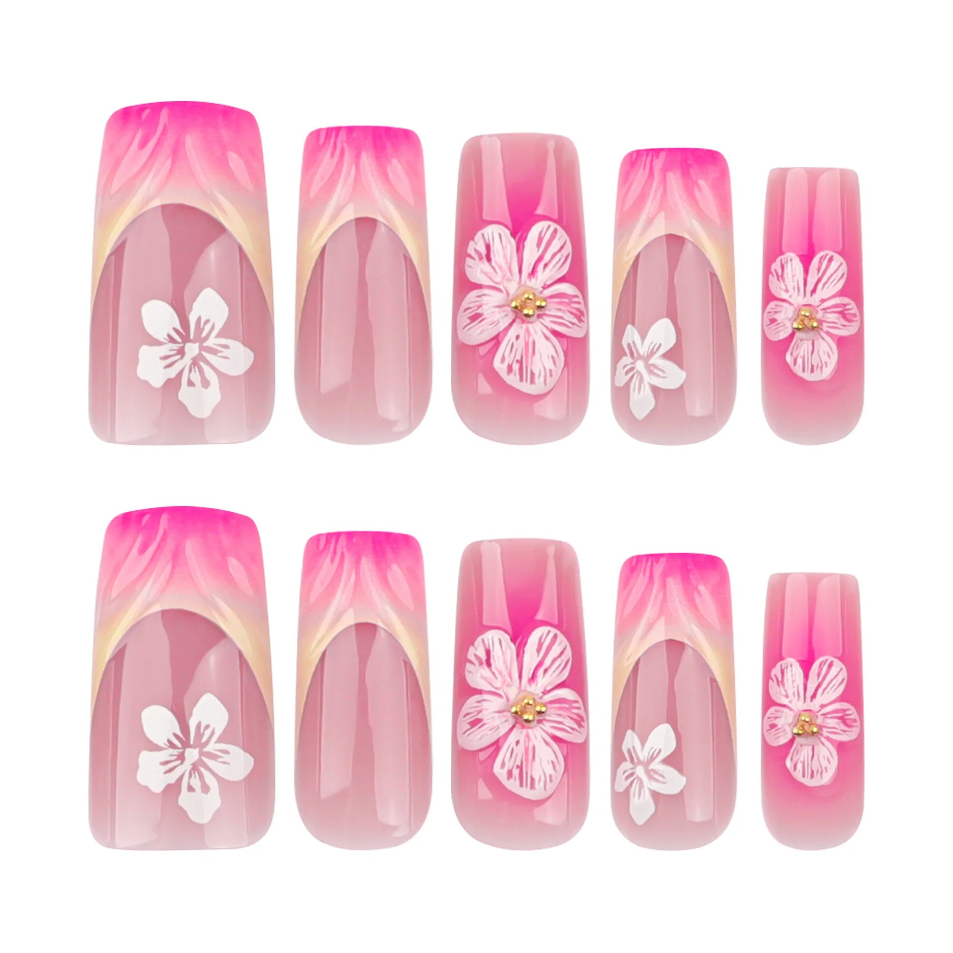 24pcs Blush Pink French Press On Nails Hand-painted White Flower Gold Ball Designs Fake Nail Short Square Korean False Nail Tips
