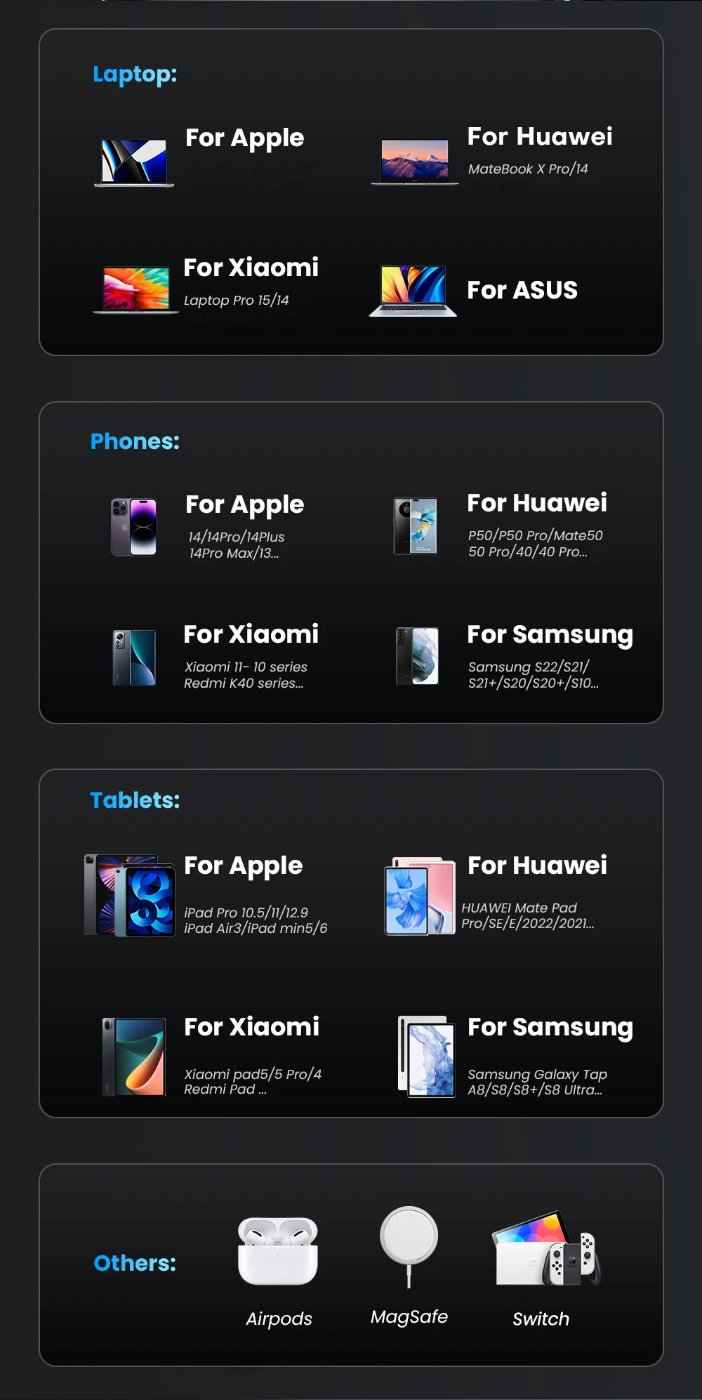 Applied Fast Charge Protocols: Samsung Adaptive Fast Charge,OPPO VOOC,Huawei FCP,USB PD,Qualcomm Quick Charge,Huawei Quick Charge