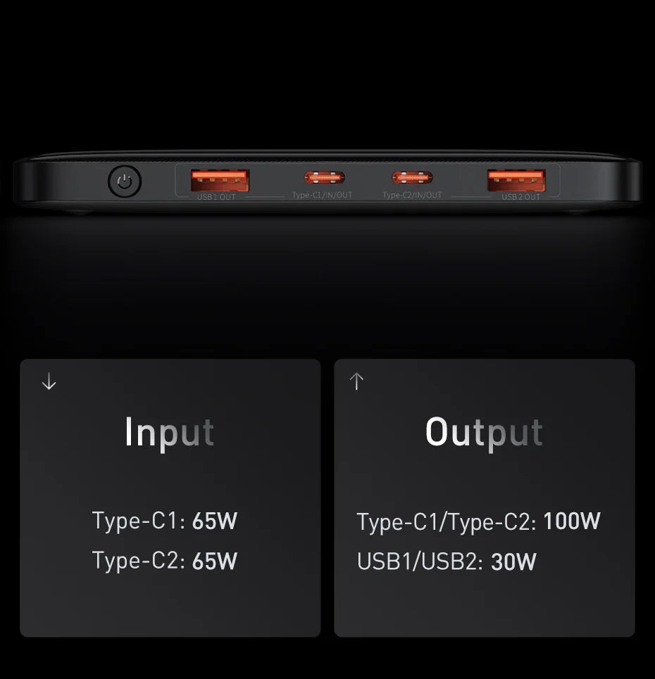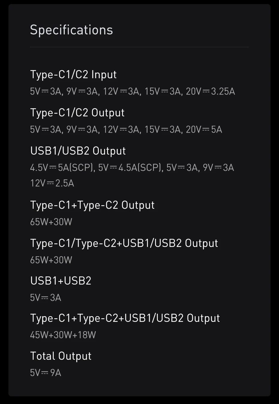 Type C1 Input: 5V/3A,9V/3A,12V/3A,15V/3A,20V/3.25A 65W