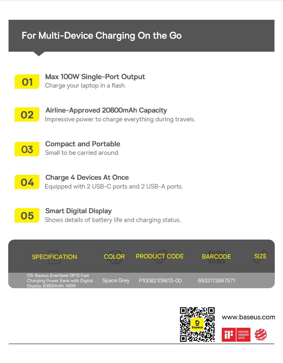 Baseus 145W Power Bank 20800mAh Dual USB A USB C PD 100W Fast Charging Digital Display Portable PowerBank for Laptop Phone Steam