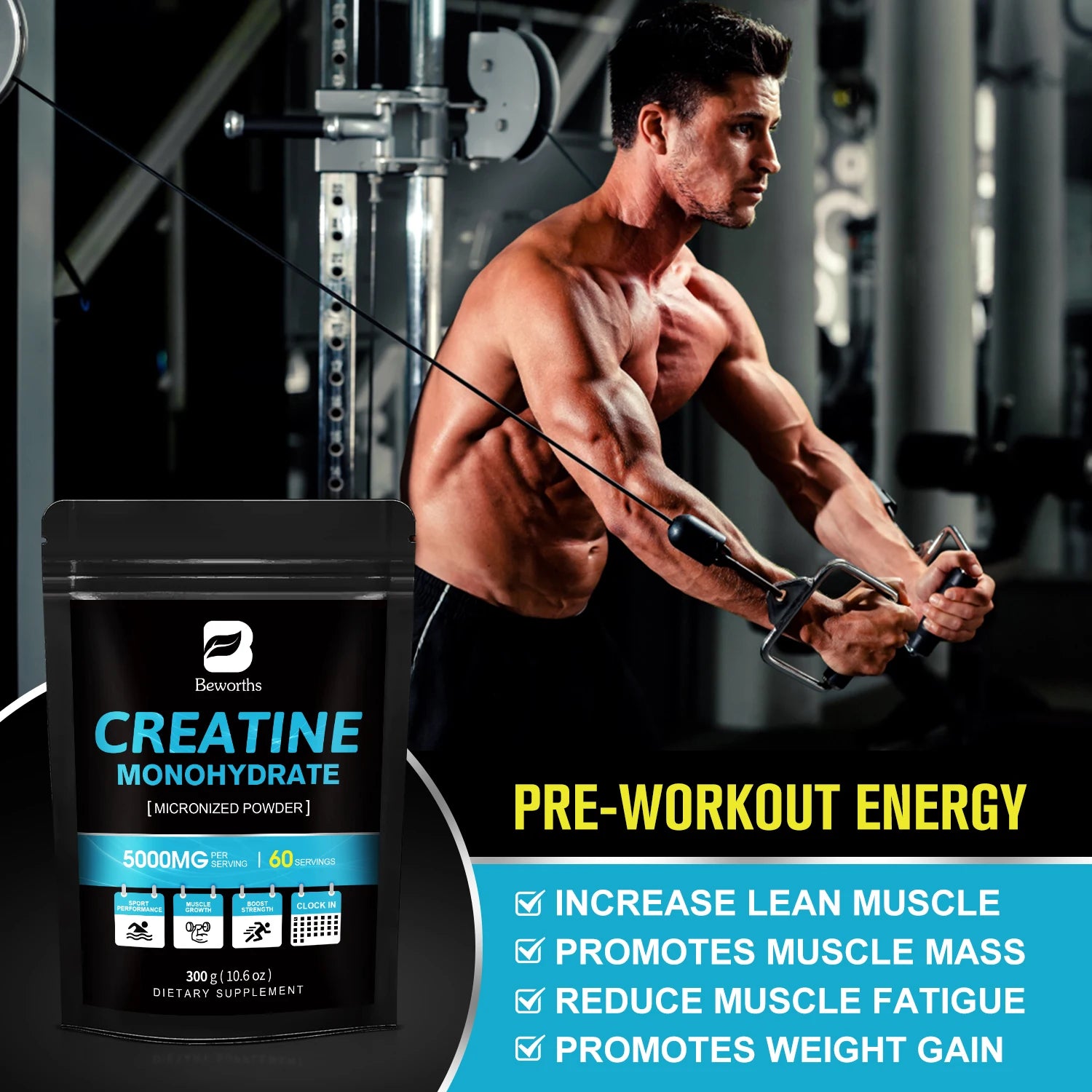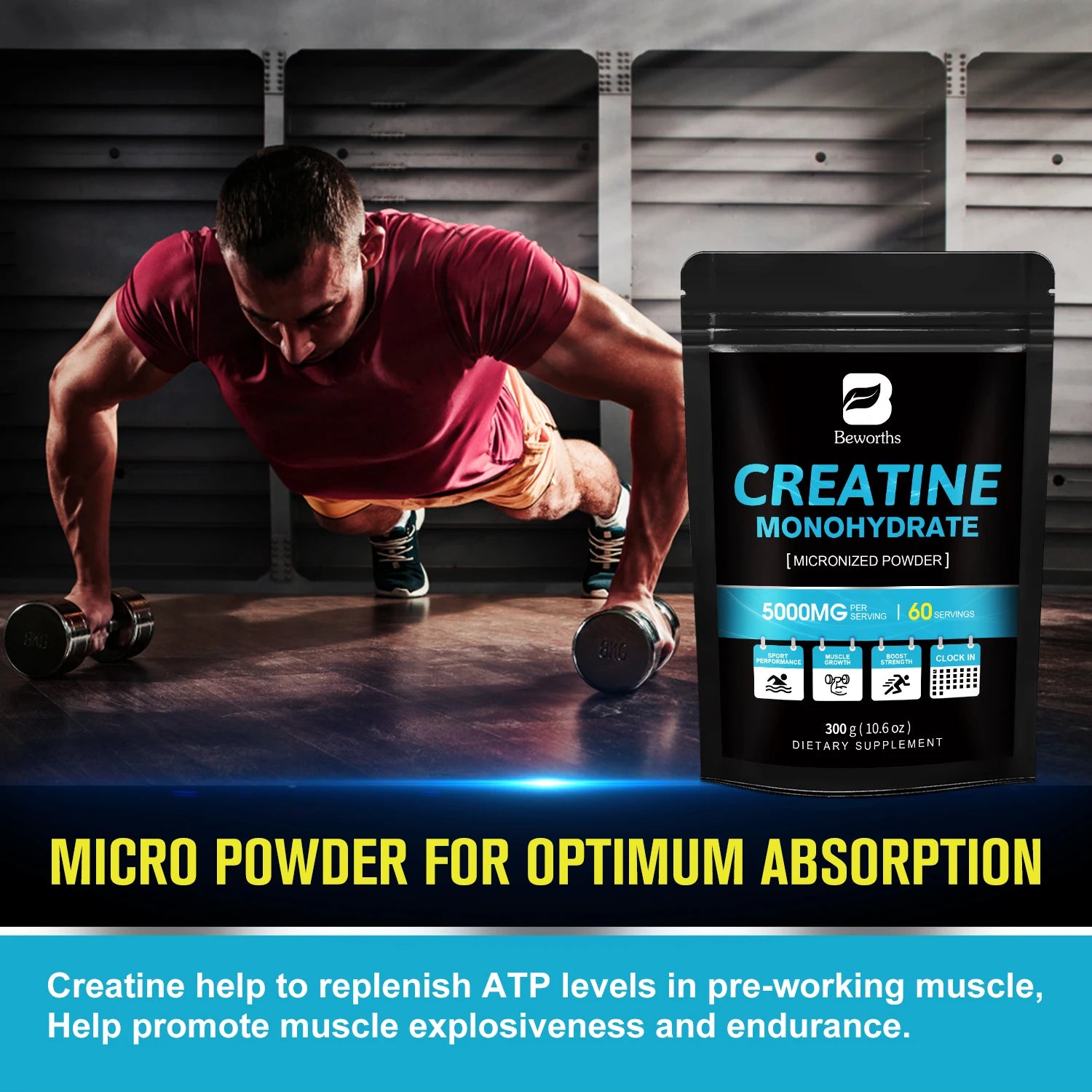 BEWORTHS 300g Creatine Monohydrate Fitness Supplements Build Muscles Muscle Endurance, Non-GMO, Gluten-Free