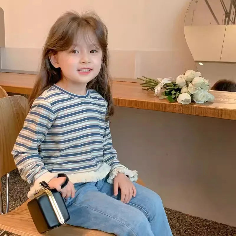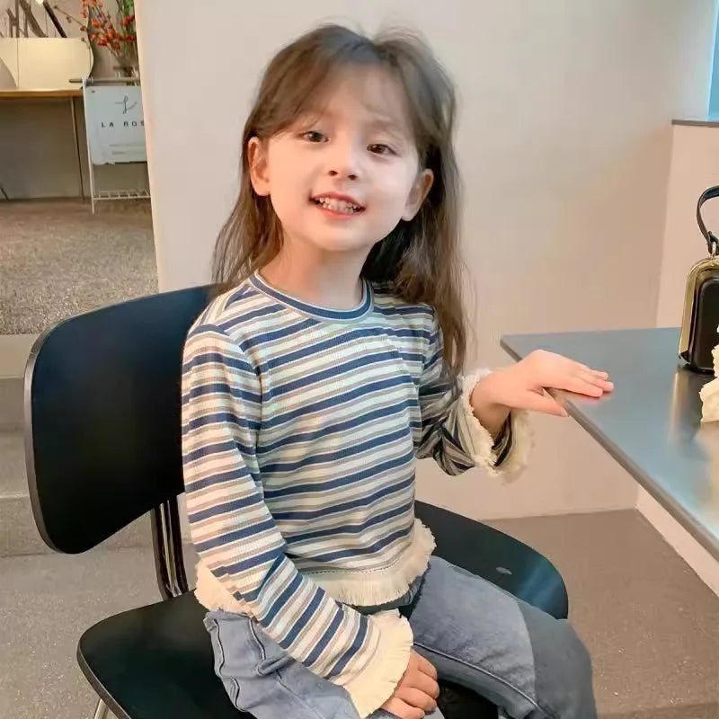 Children's T-Shirts Children's Striped Long-sleeved Baby Girls T-shirt Tassel Cuff Crew Neck Top Girl Clothes
