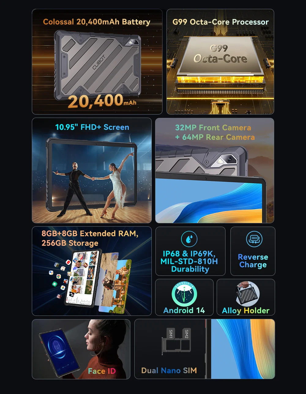 Cubot Tab KingKong 2, Rugged Tablet Android 14, Helio G99, 20400mAh Battery,16GB RAM+256GB ROM, IP68 Waterproof, 10.95" Screen