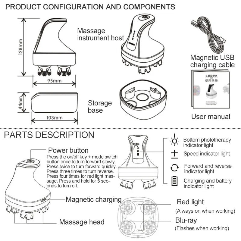 4 Massage mode: Slow / Fast / Reverse fast / red and blue light massage