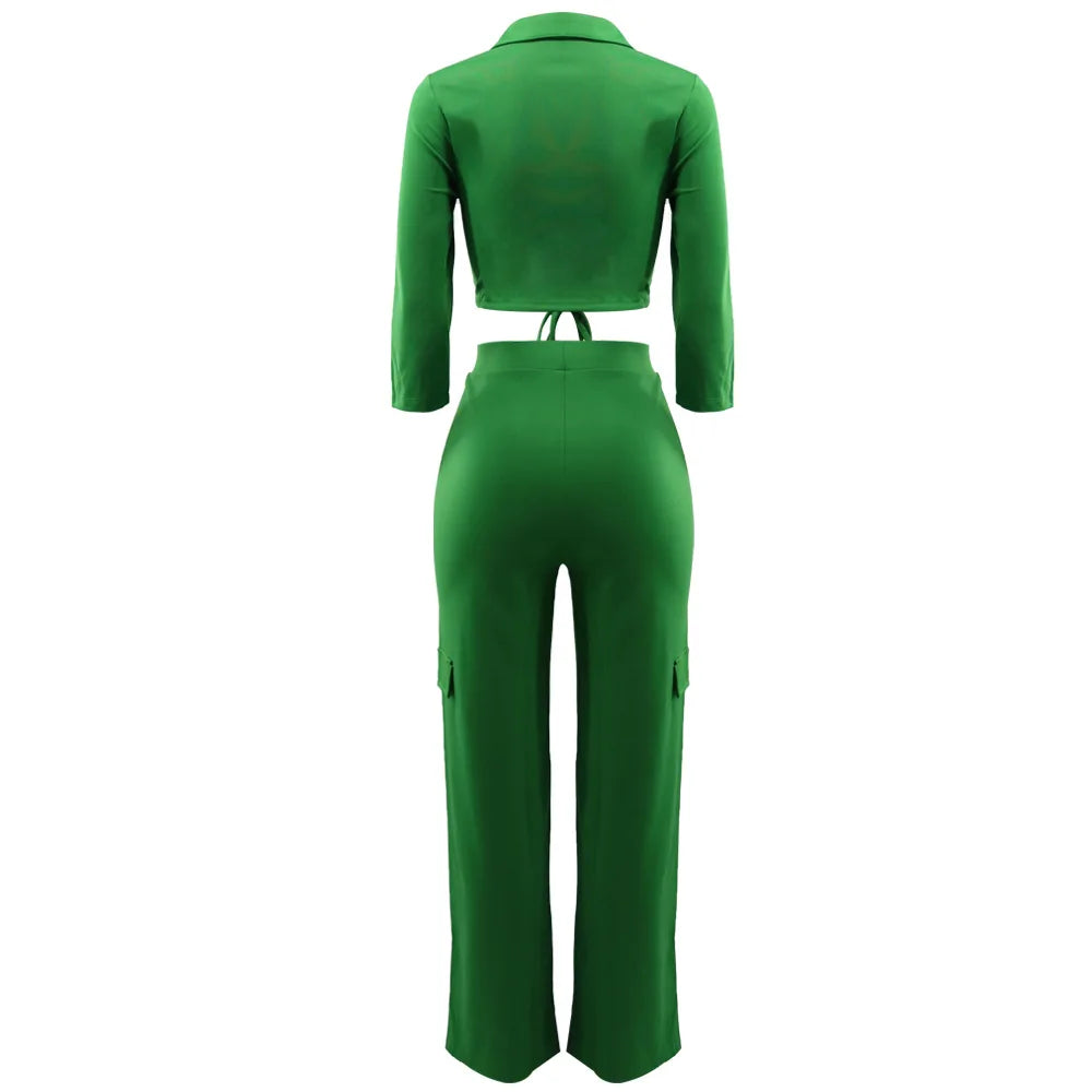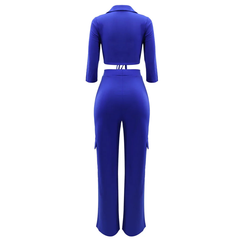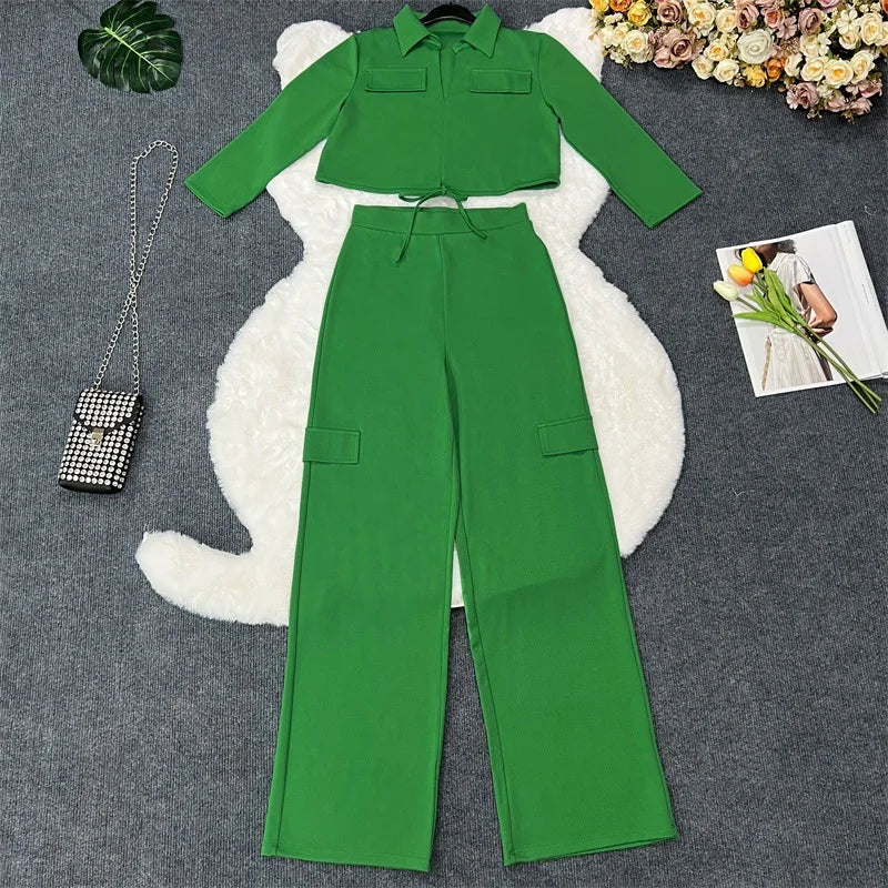Elegant Office Women Two Piece Sets Autumn V Turn-down Neck Half Sleeve Drawstring Lace Up Short Shirt + Wide Leg Trousers Set