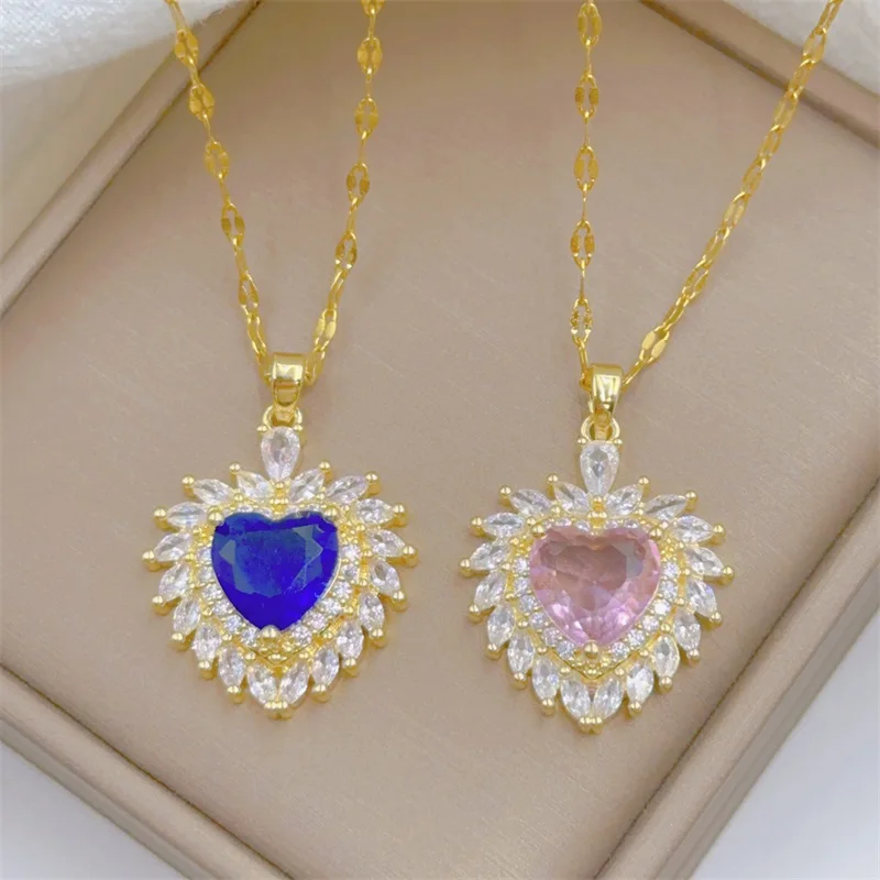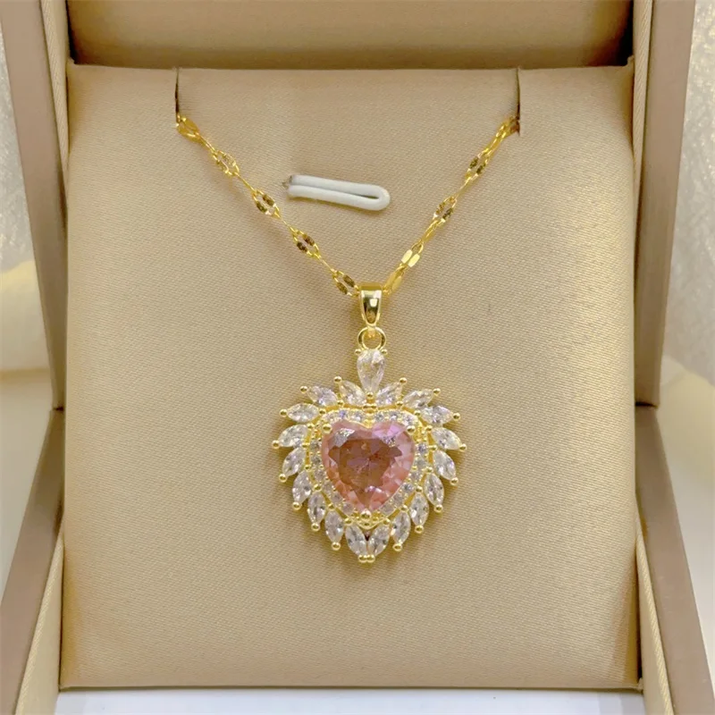 Exquisite and Cute Micro-paved Pink Necklace, Fashionable Retro Style Versatile Stainless Steel Clavicle Chain