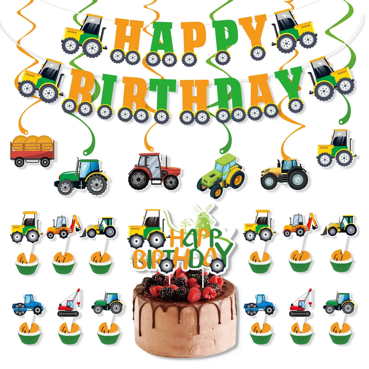 Farm Green Tractor Supplies Tractor Balloons Banner Hanging Swirl Cupcake Toppers Tractor Farm Themed Birthday Party Decorations