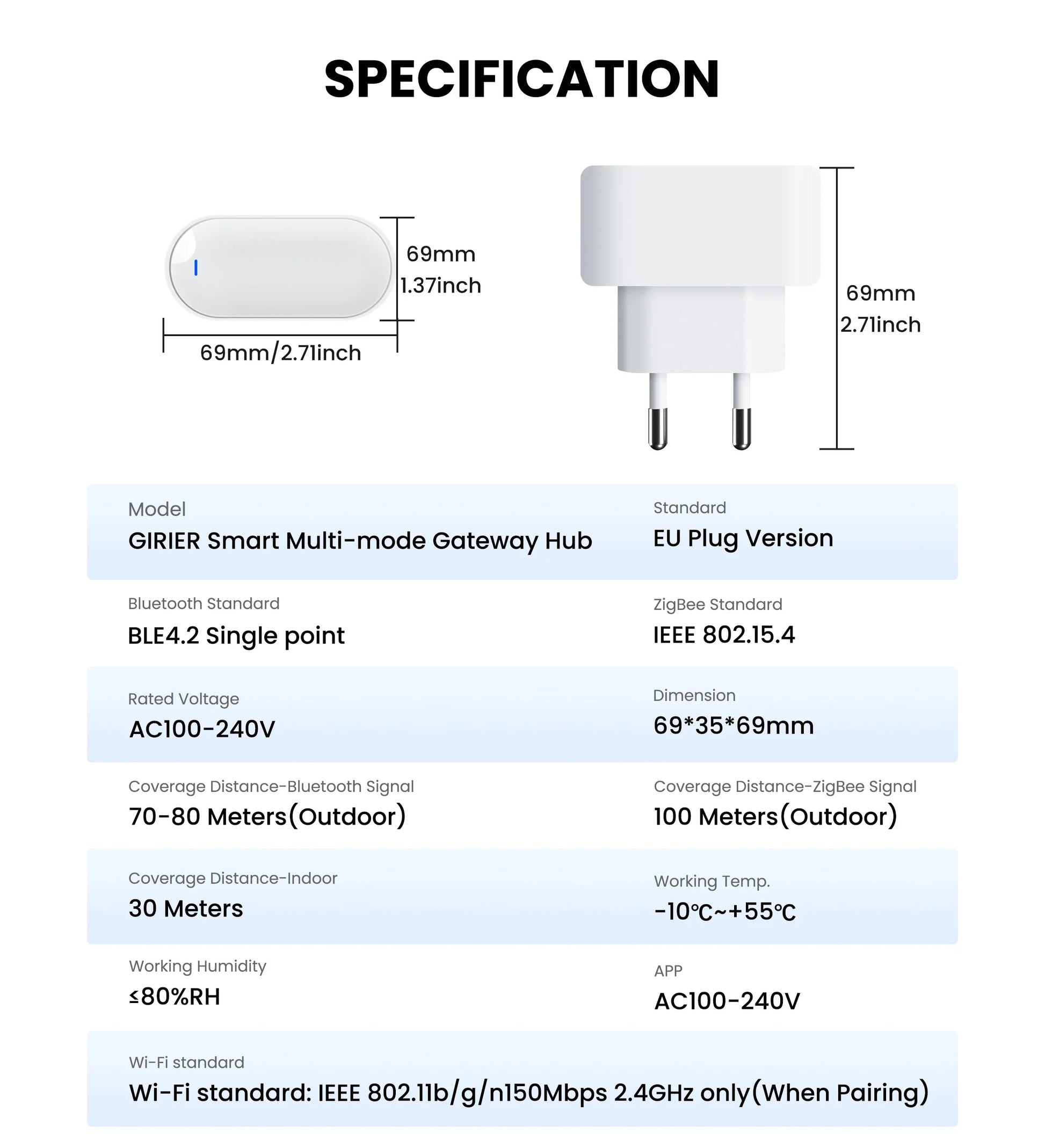 GIRIER Tuya ZigBee Gateway Hub Plug-in Type Multi-mode ZigBee Gateway Bridge Bluetooth Mesh Hub Supports Smart Home Automation
