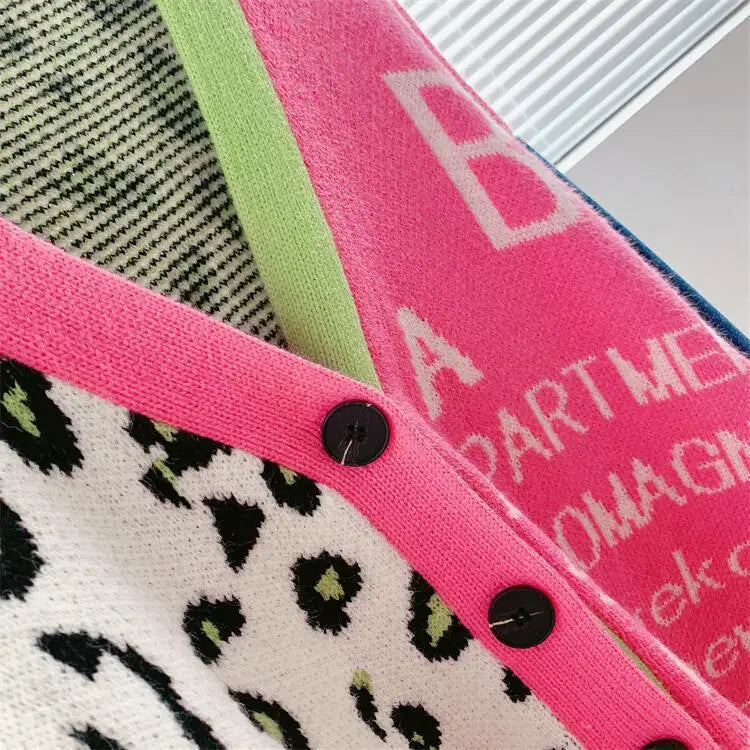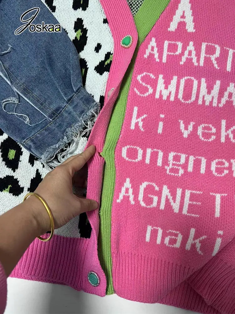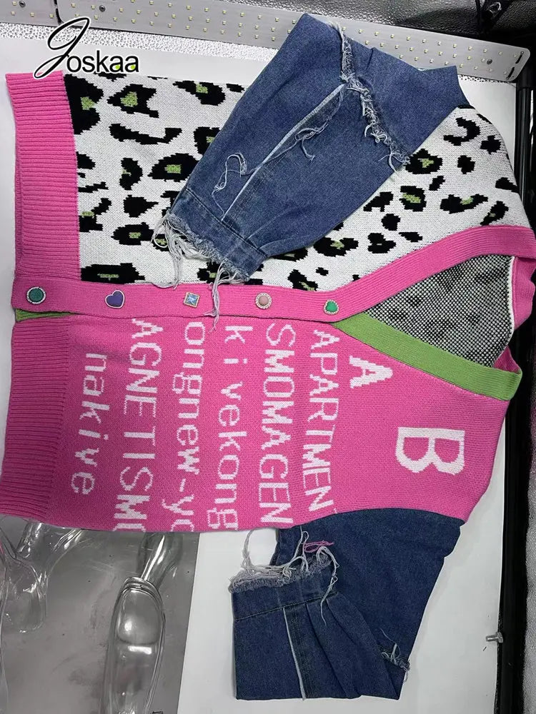 Joskaa Women Knitted Oversized Sweaters Y2k Denim Patchwork Leopard V-neck Long Sleeve Cardigans Coat Female Outwear Streetwear