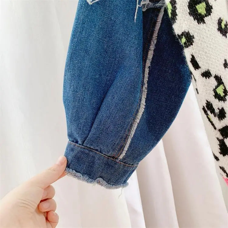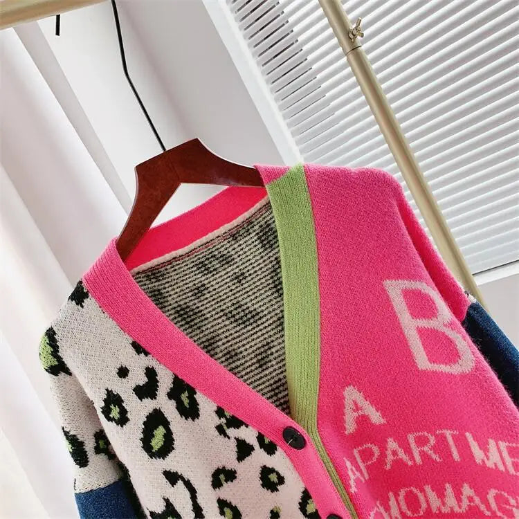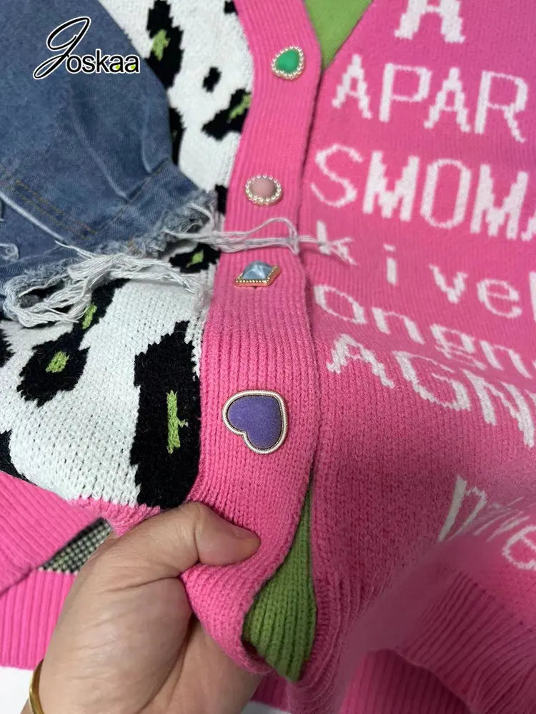 Joskaa Women Knitted Oversized Sweaters Y2k Denim Patchwork Leopard V-neck Long Sleeve Cardigans Coat Female Outwear Streetwear