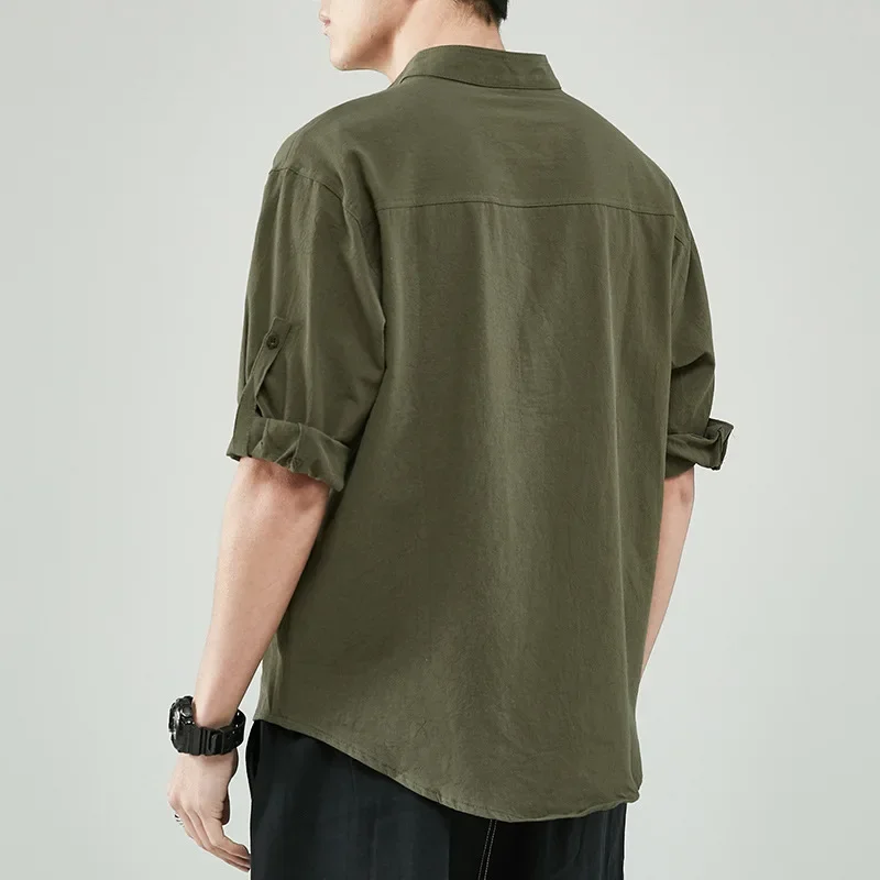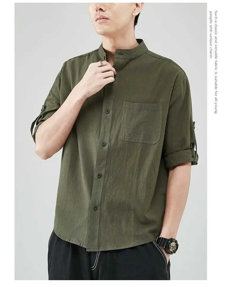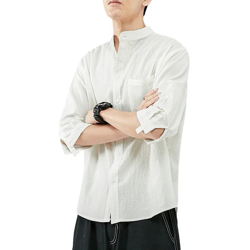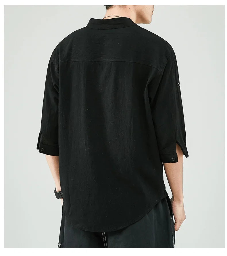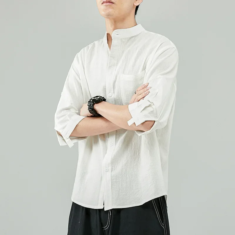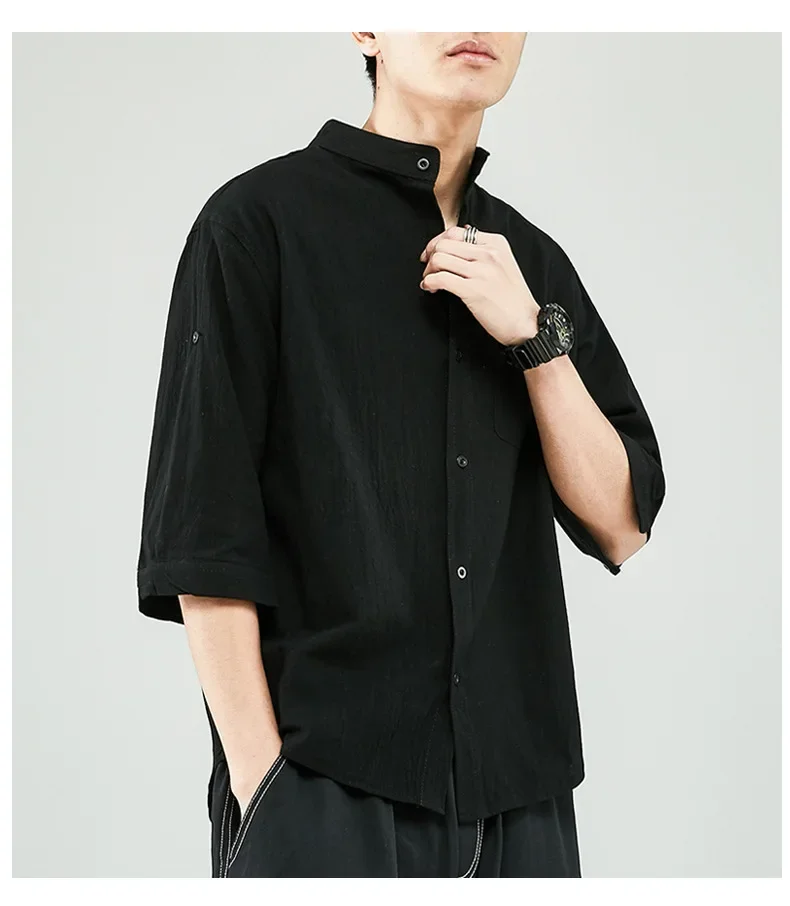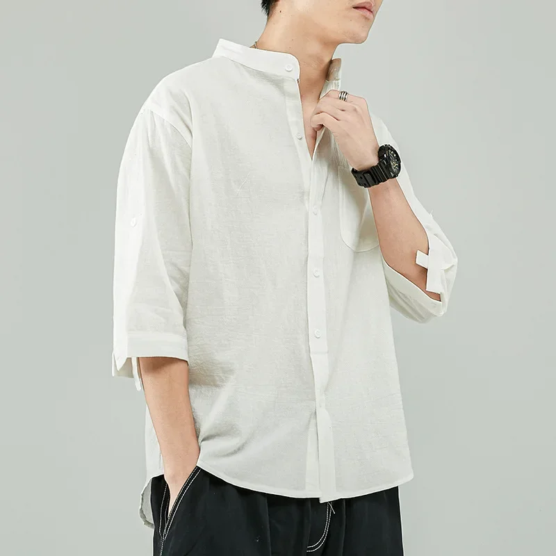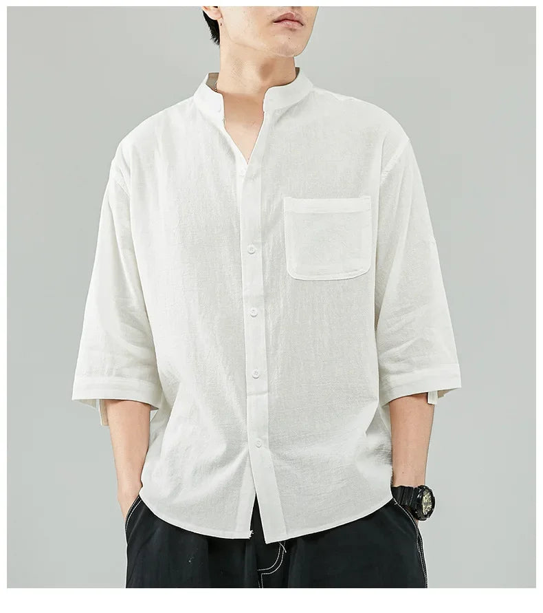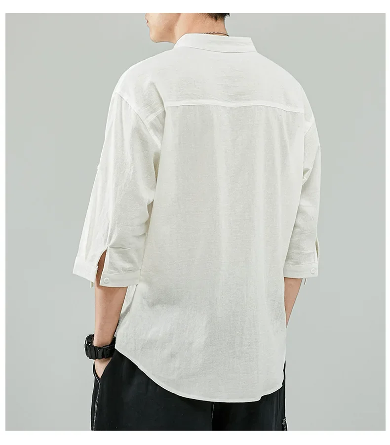 Line Shirt Men's Short-sleeved White Shirt Loose Chinese Style Summer Cotton Linen Casual Jacket Men's Quarter-sleeved Top