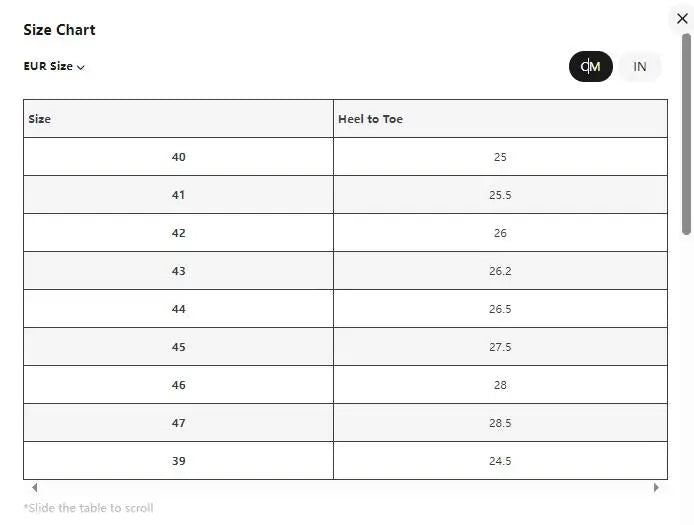 size_info: {"sizeInfoList":[{"length":{"cm":"25","inch":"9.84"},"size":"40","vid":-13},{"length":{"cm":"25.5","inch":"10.04"},"size":"41","vid":-14},{"length":{"cm":"26","inch":"10.24"},"size":"42","vid":-15},{"length":{"cm":"26.2","inch":"10.31"},"size":"43","vid":-16},{"length":{"cm":"26.5","inch":"10.43"},"size":"44","vid":-17},{"length":{"cm":"27.5","inch":"10.83"},"size":"45","vid":-18},{"length":{"cm":"28","inch":"11.02"},"size":"46","vid":-19},{"length":{"cm":"28.5","inch":"11.22"},"size":"47","vid":-20},{"length":{"cm":"24.5","inch":"9.65"},"size":"39","vid":-25}]}
