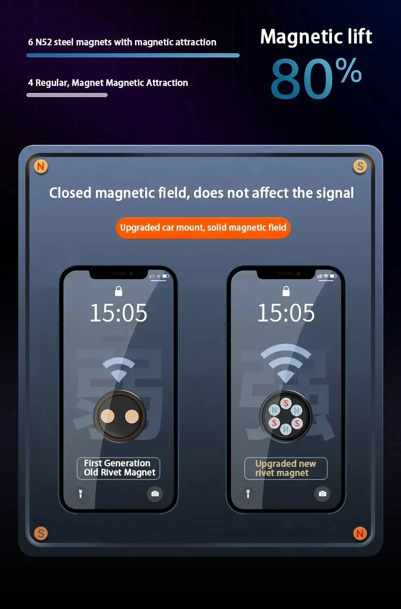 Features8: Strong magnetic suction, stable and reliable: Using advanced magnetic suction technology, the mobile phone is instantly absorbed and fits tightly. Even when driving on a bumpy road, the mobile phone remains as stable as a rock.