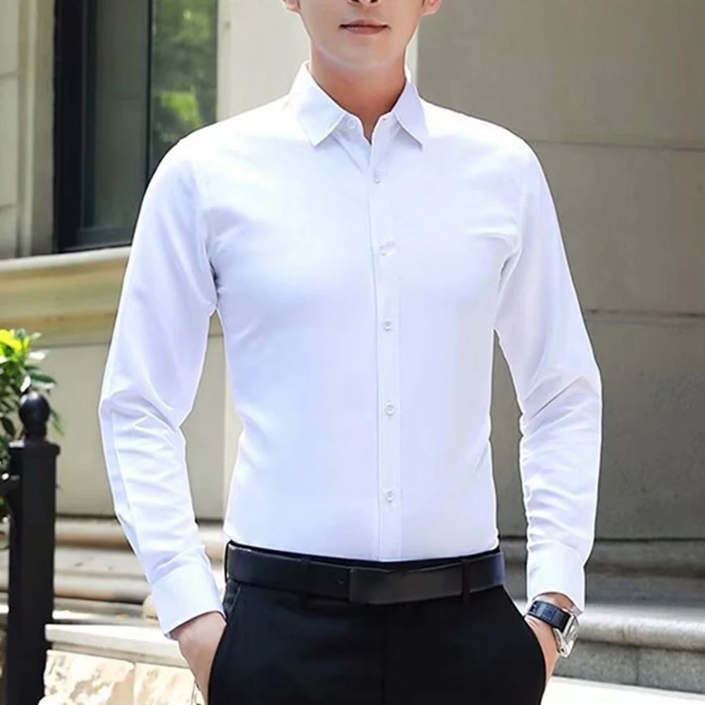 New Men\'s Long Sleeve Drill Button Shirts Tight Business Formal Social Wrinkle Lapel Casual Solid Simple Fashion Male T-shirts