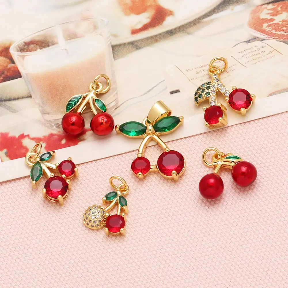OCESRIO Crystal Green Leaves Cherry Pendant for Necklaces Copper Gold Plated Enamel Fruit Jewelry Making Component pdtb791
