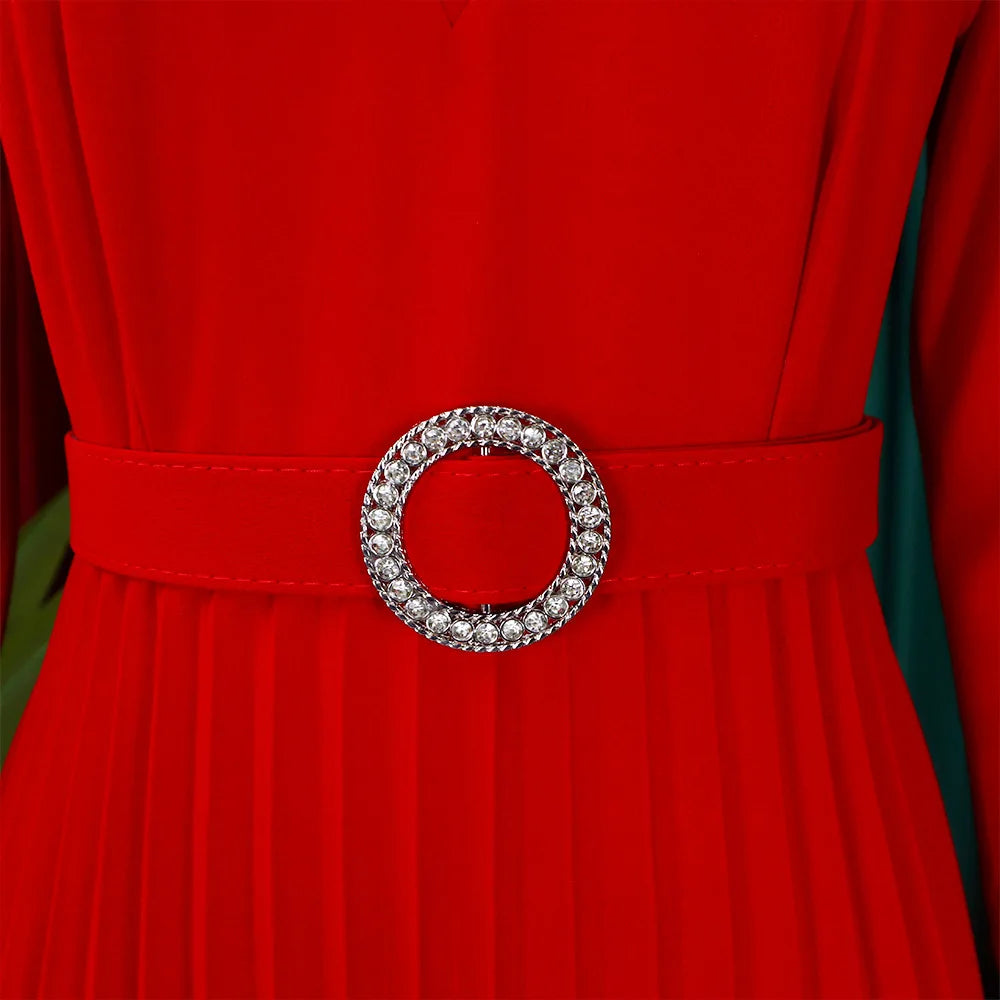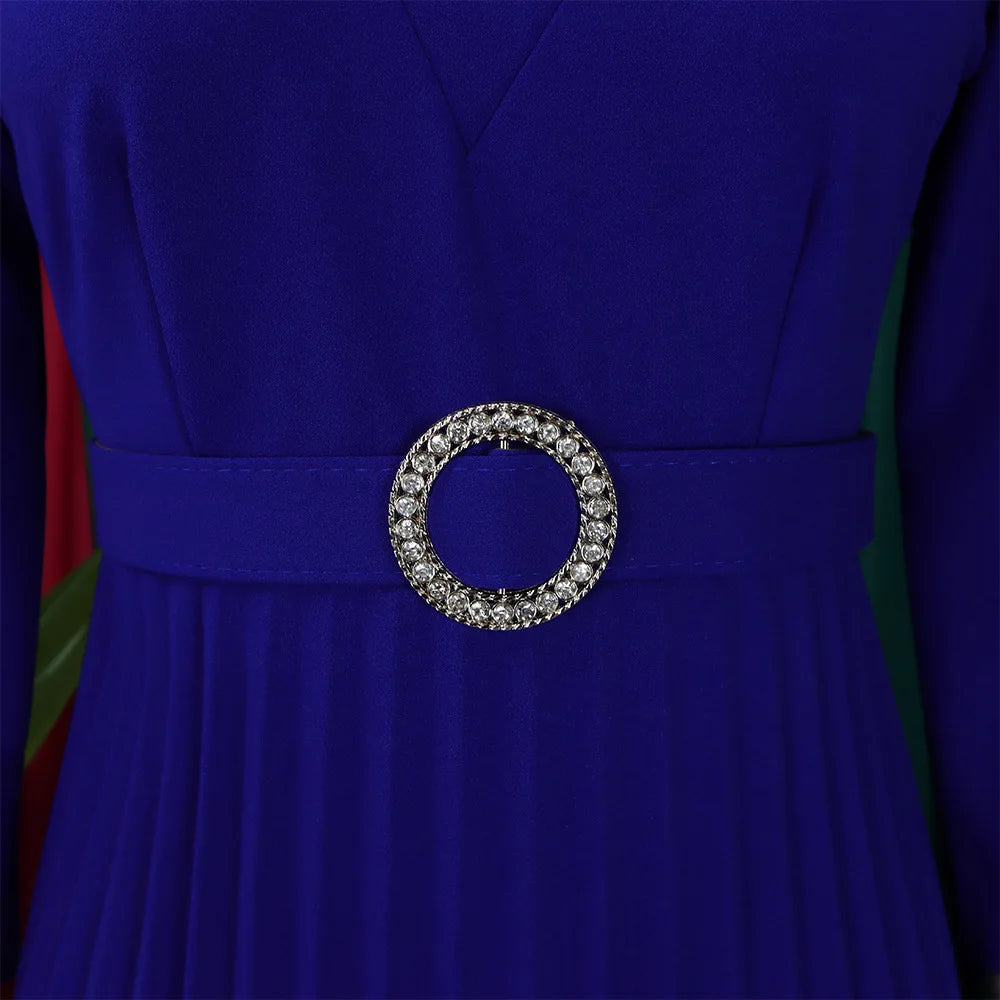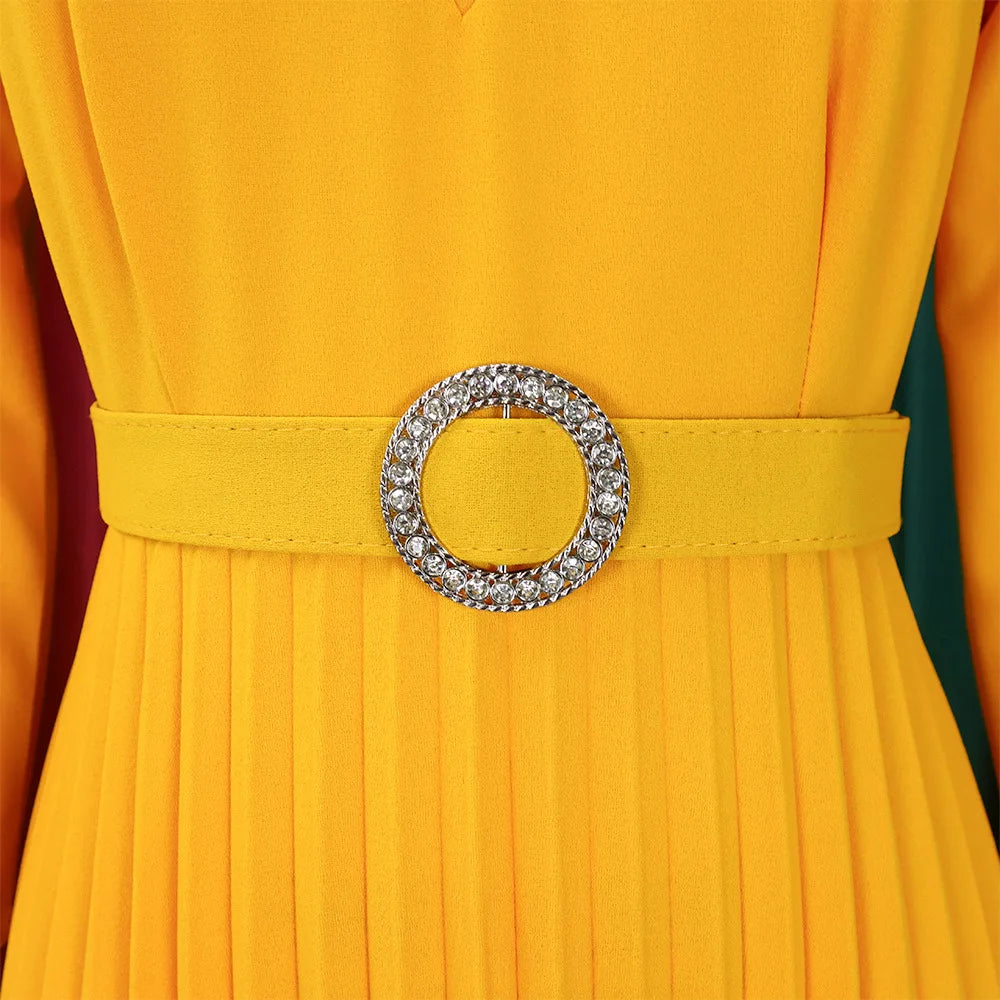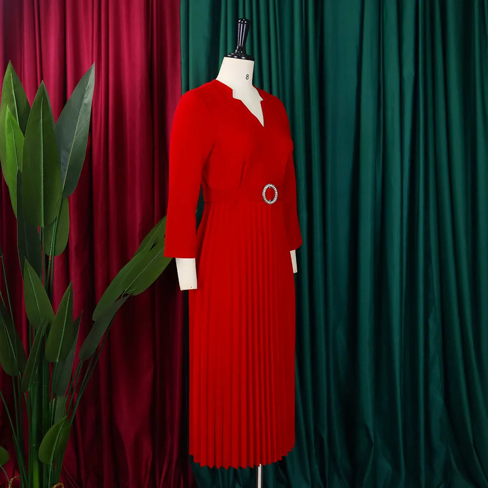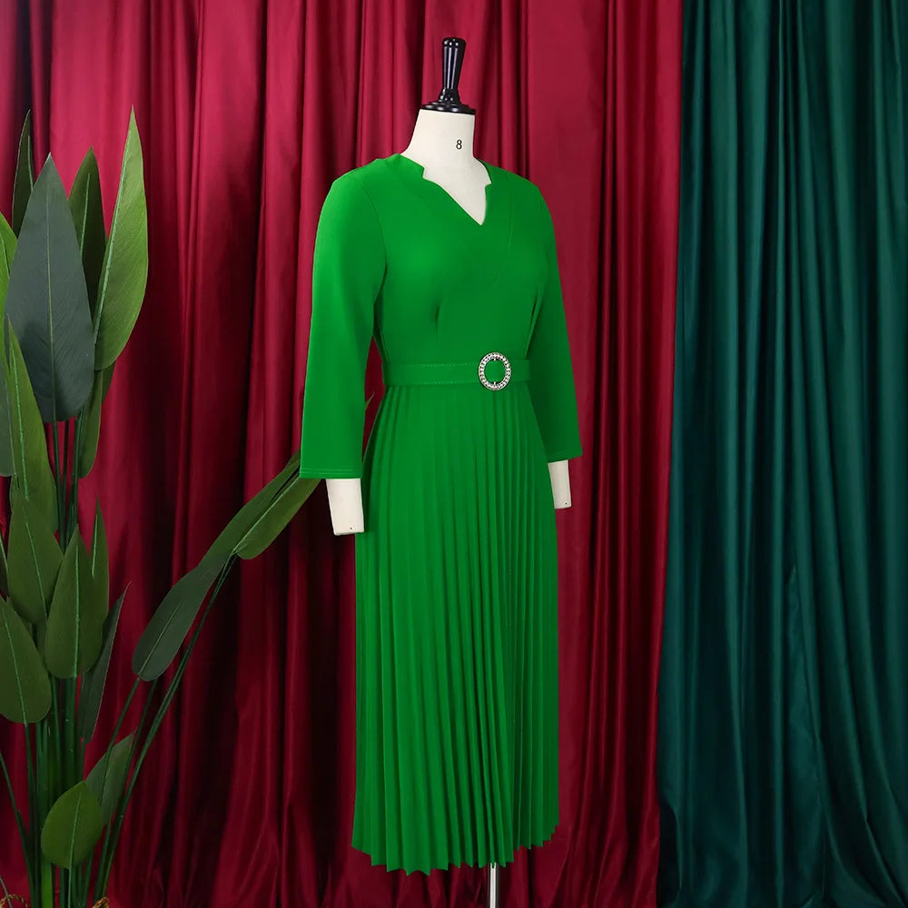 Office Dresses for Women V Neck Full Sleeve Belt Waisted Pleated Mid Calf Elegant Female Business Work Wear Dress Midi Cloth New