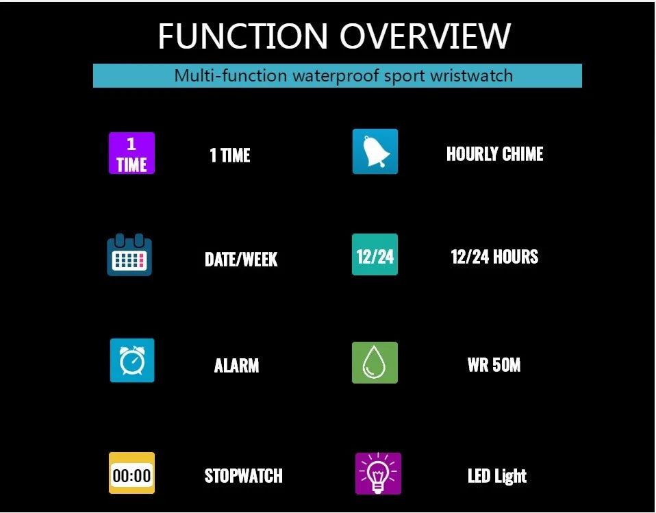 Feature: Stop Watch,Back Light,Led Display,Auto Date,Water-Resistance,Alarm,swim,Week Display