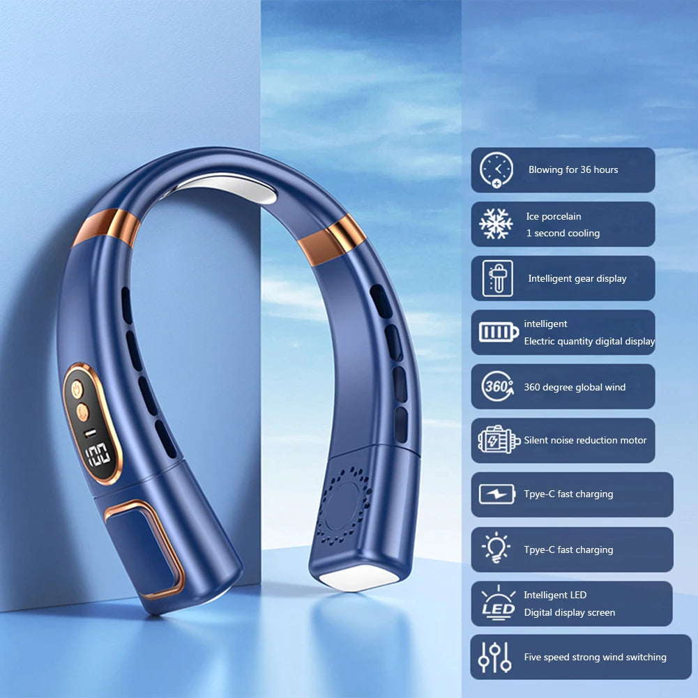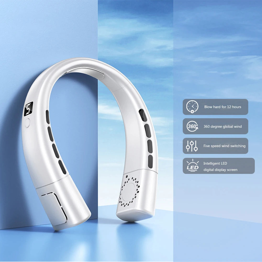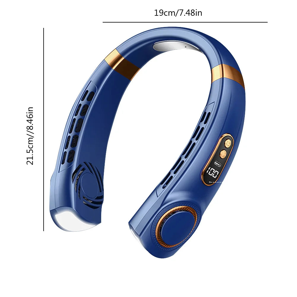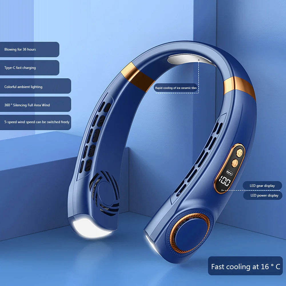 Portable Neck Fan LED Digital Display Hanging Neck Fan Leafless Air Cooler Mute USB Rechargeable Cooler with Atmosphere Light