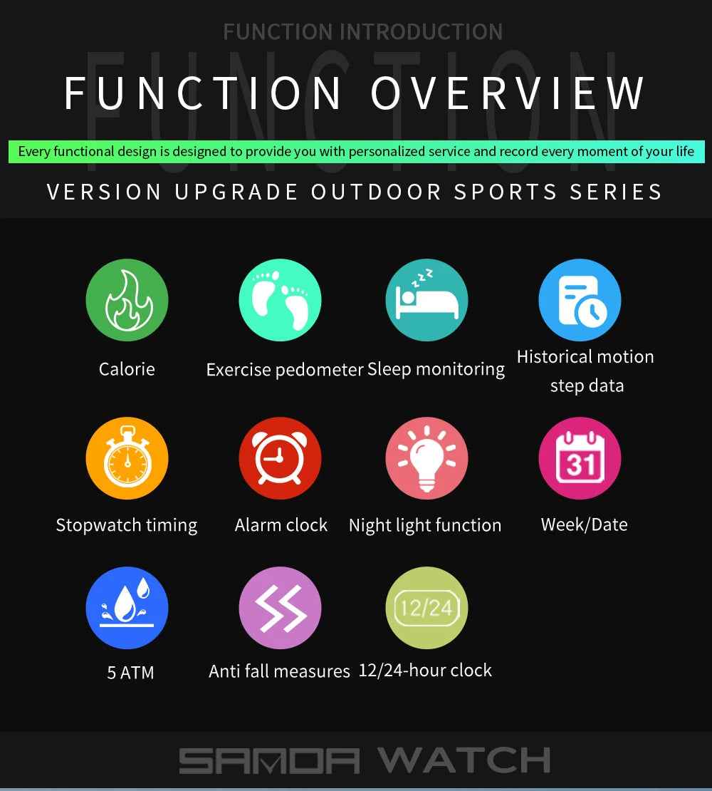 Feature: Luminous,Steps Tracker,Phone calls,Shock Resistant,Led Display,DIVER,Alarm,Week Display