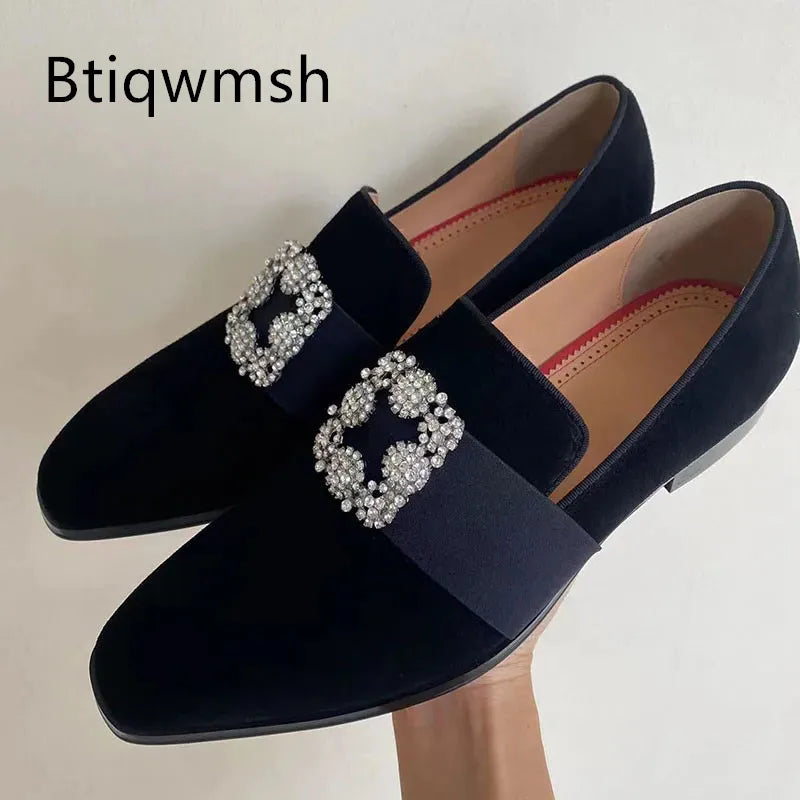 Silver Rhinestone Shoes Man Pointed Toe Black Real Suede Flats Male Fashion Wedding Shoes