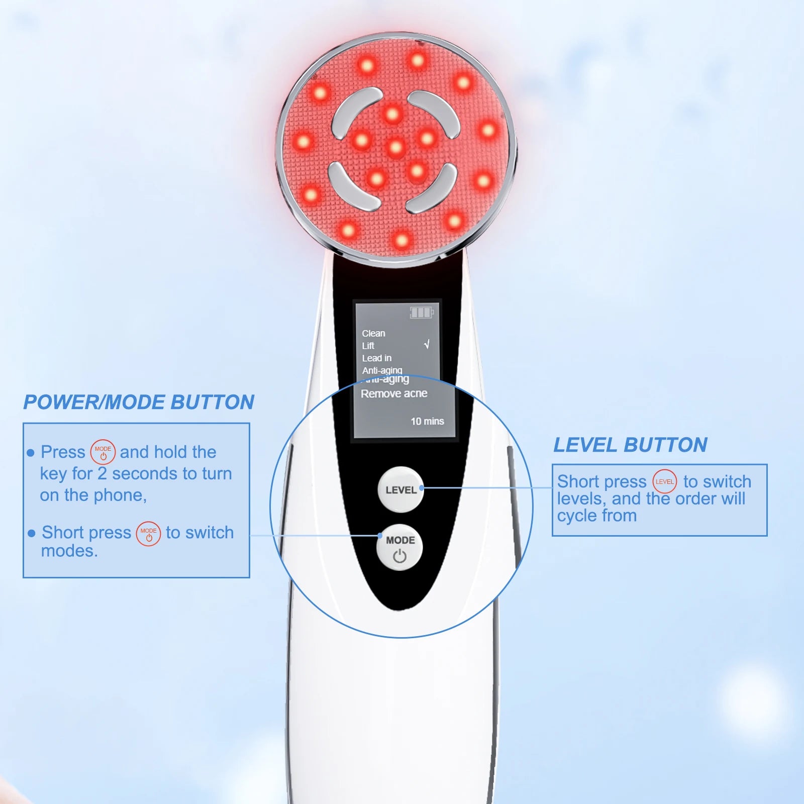 Working Principle: ION+,ION-,LED,RF,EMS,WARM,vibration massage