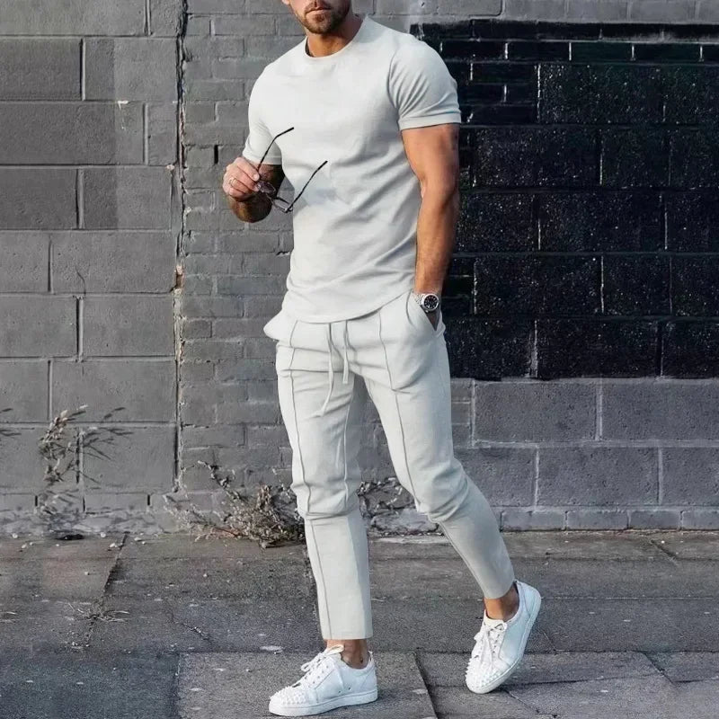Sports Set Mens Fall 2023 Summer Solid Casual Round Neck Short Sleeve Sports T-shirt Two Piece Set for Men