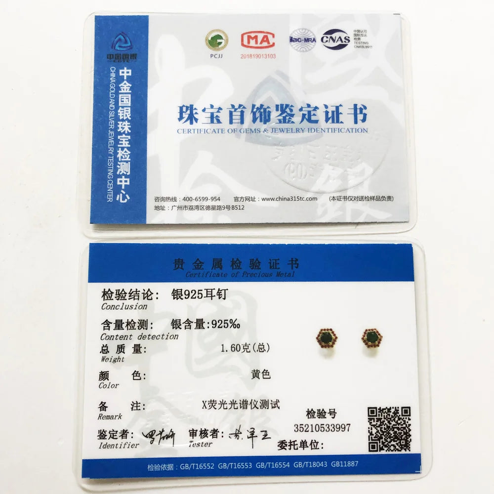 Studs Earrings Hexagon Green,Europe Yellow Gold Color Hand-set Jewelry For Women Playful Look Gift 925 Sterling Silver