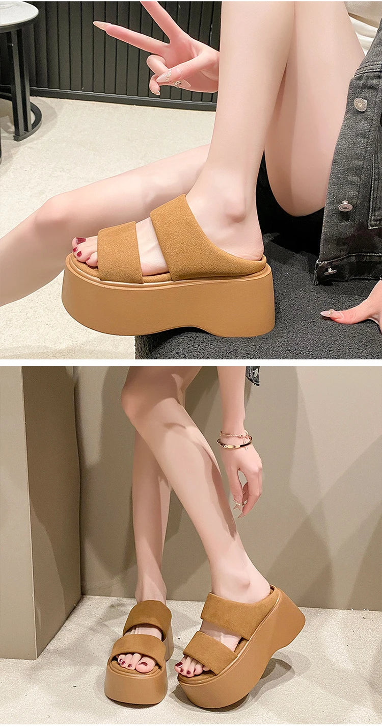 Summer 2023 Chunky Sandals Women's Thick Bottom Wedge Heels Slides 8CM High Heels Platform Leather Casual Beach Flip Flops Woman