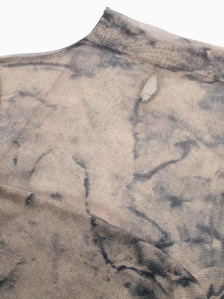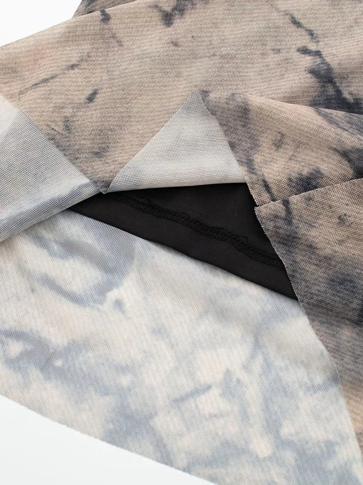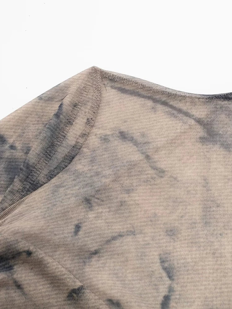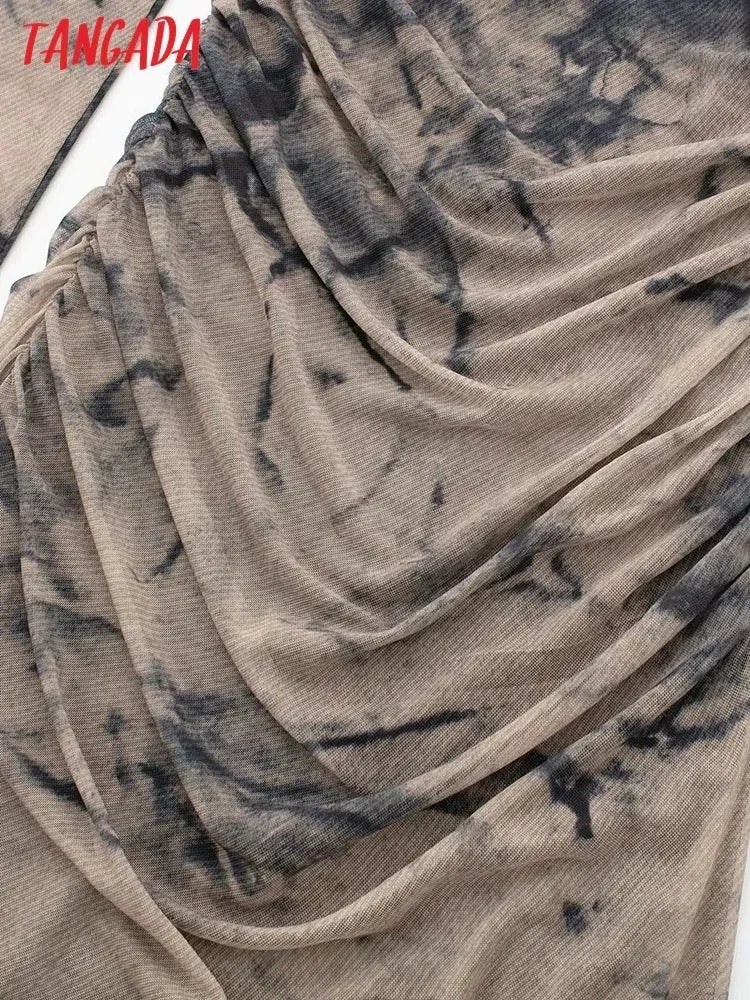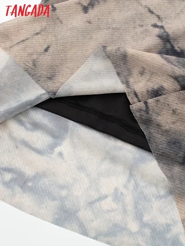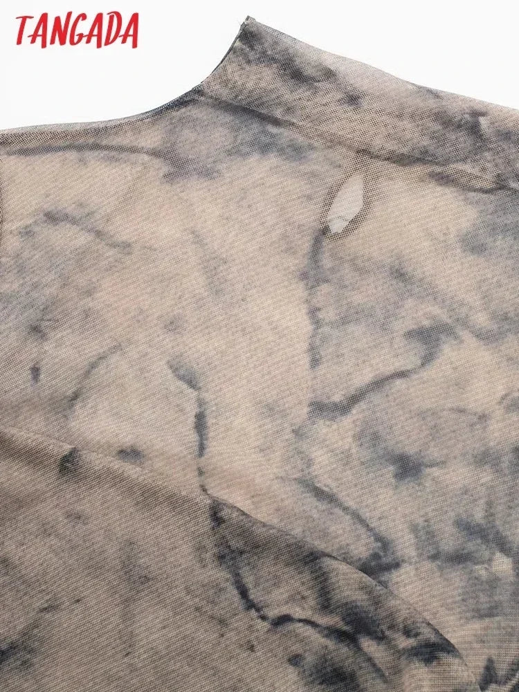 Tangada 2024 Women Print Pleated Mesh Dress Long Sleeve Sexy Famle Stand Collar Maxi Dresses 3H406