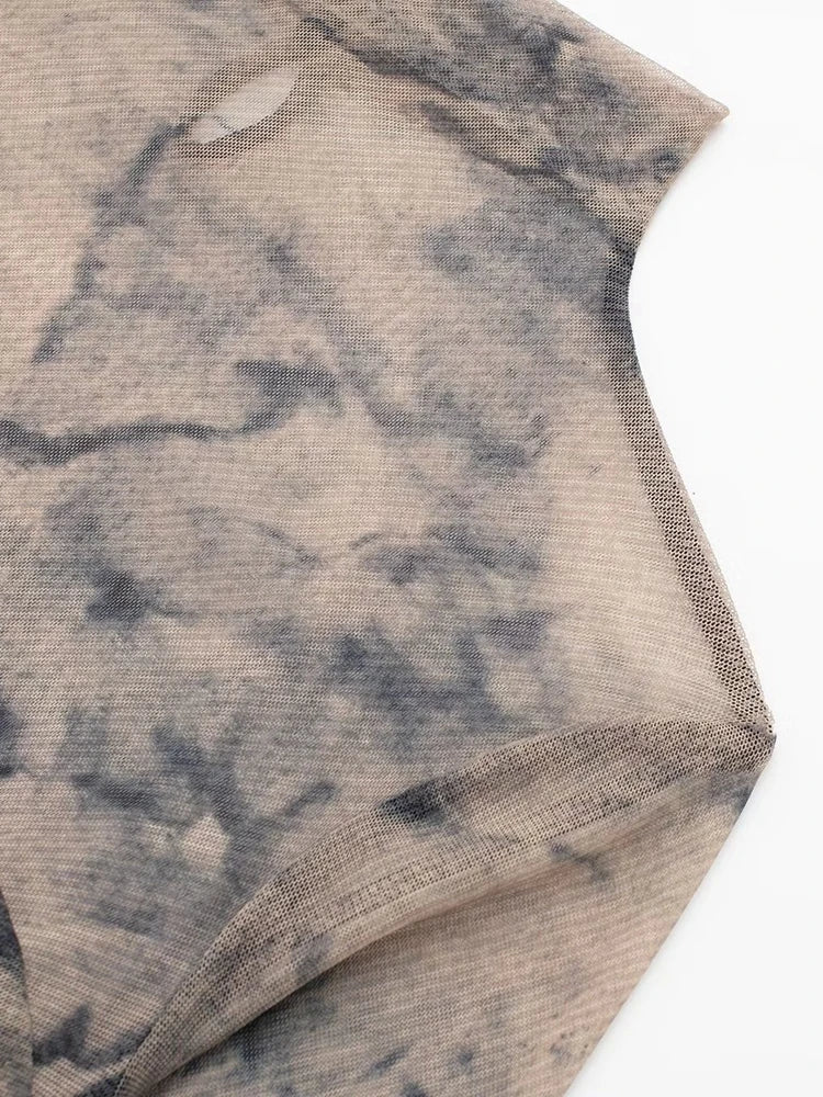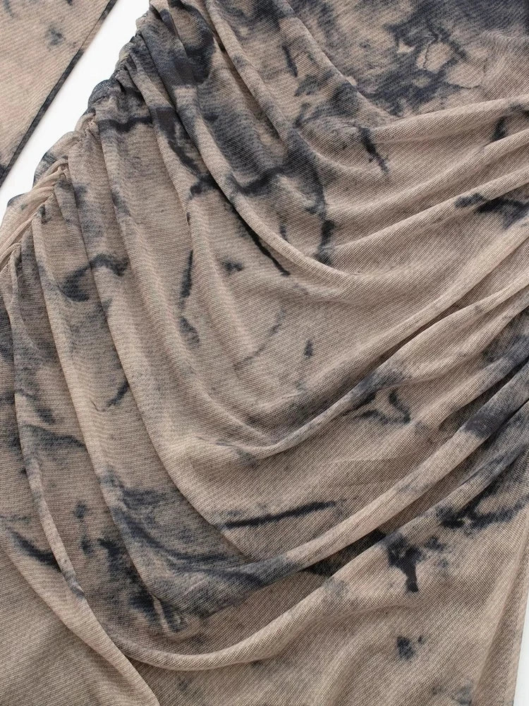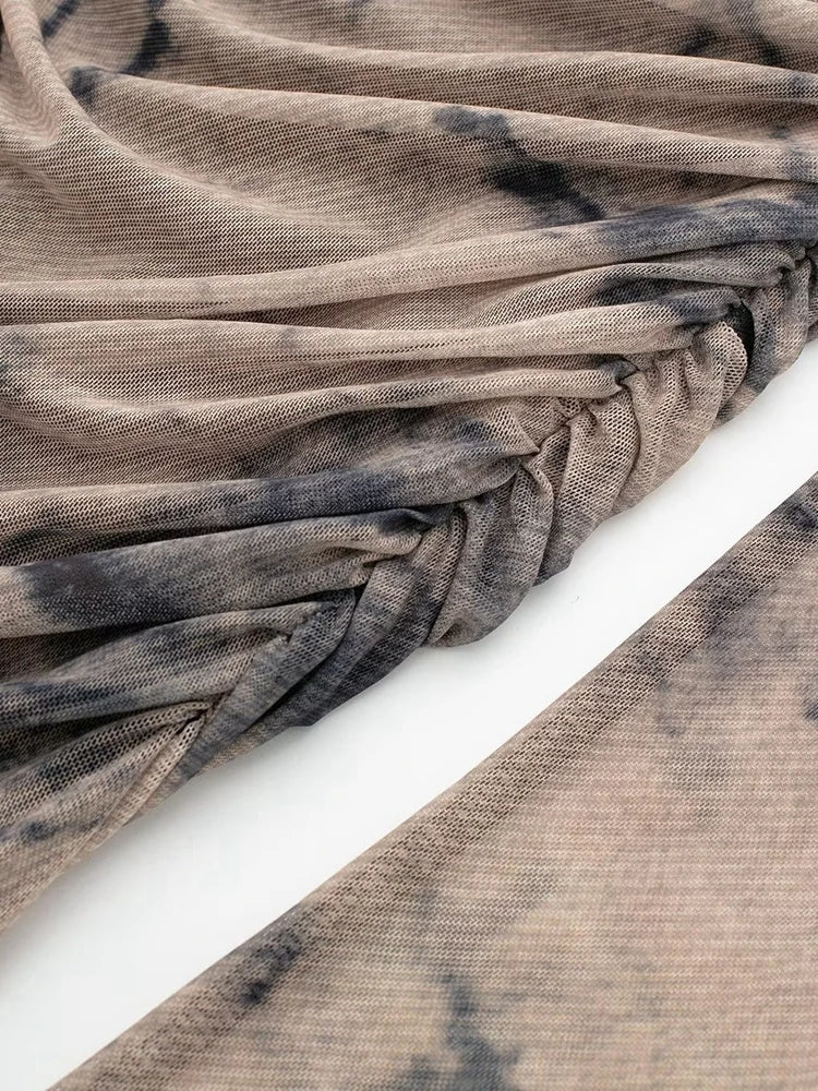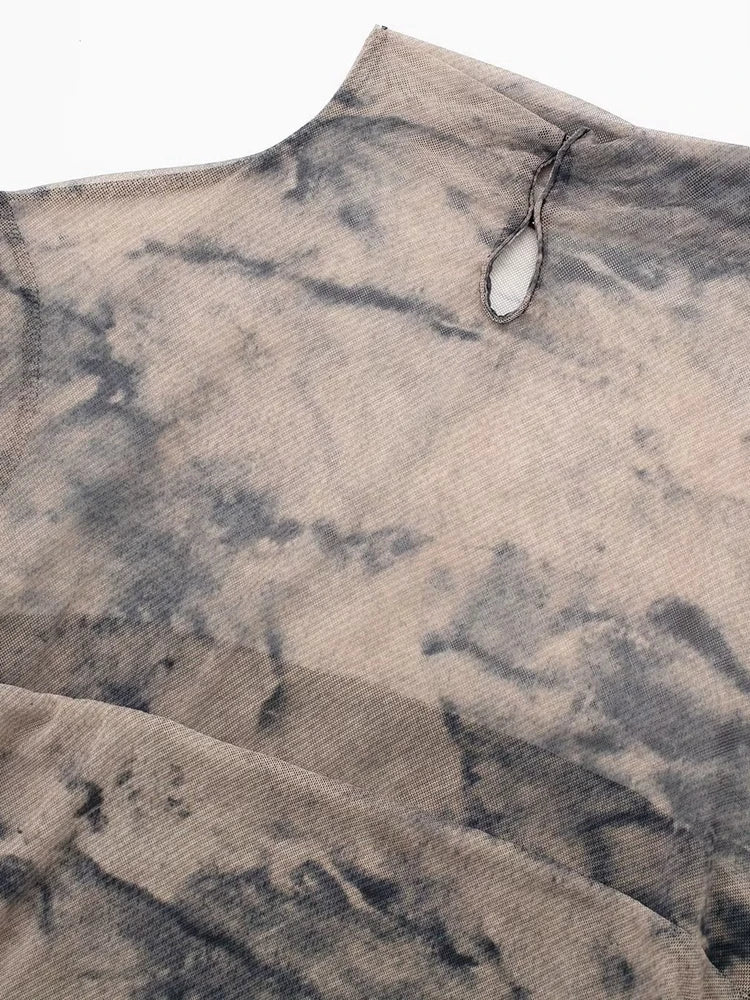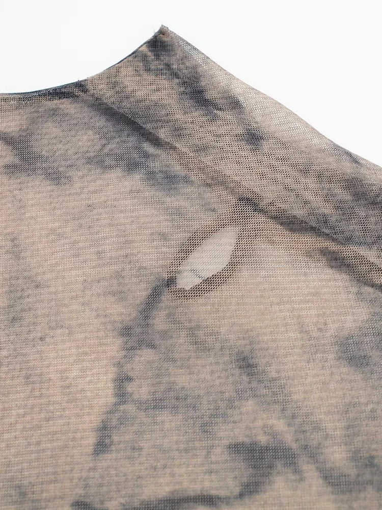 Tangada 2024 Women Print Pleated Mesh Dress Long Sleeve Sexy Famle Stand Collar Maxi Dresses 3H406