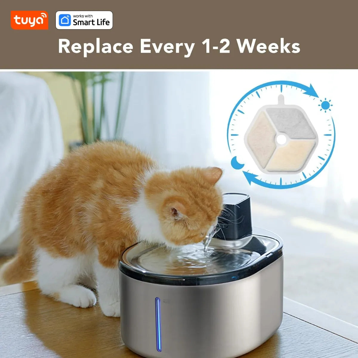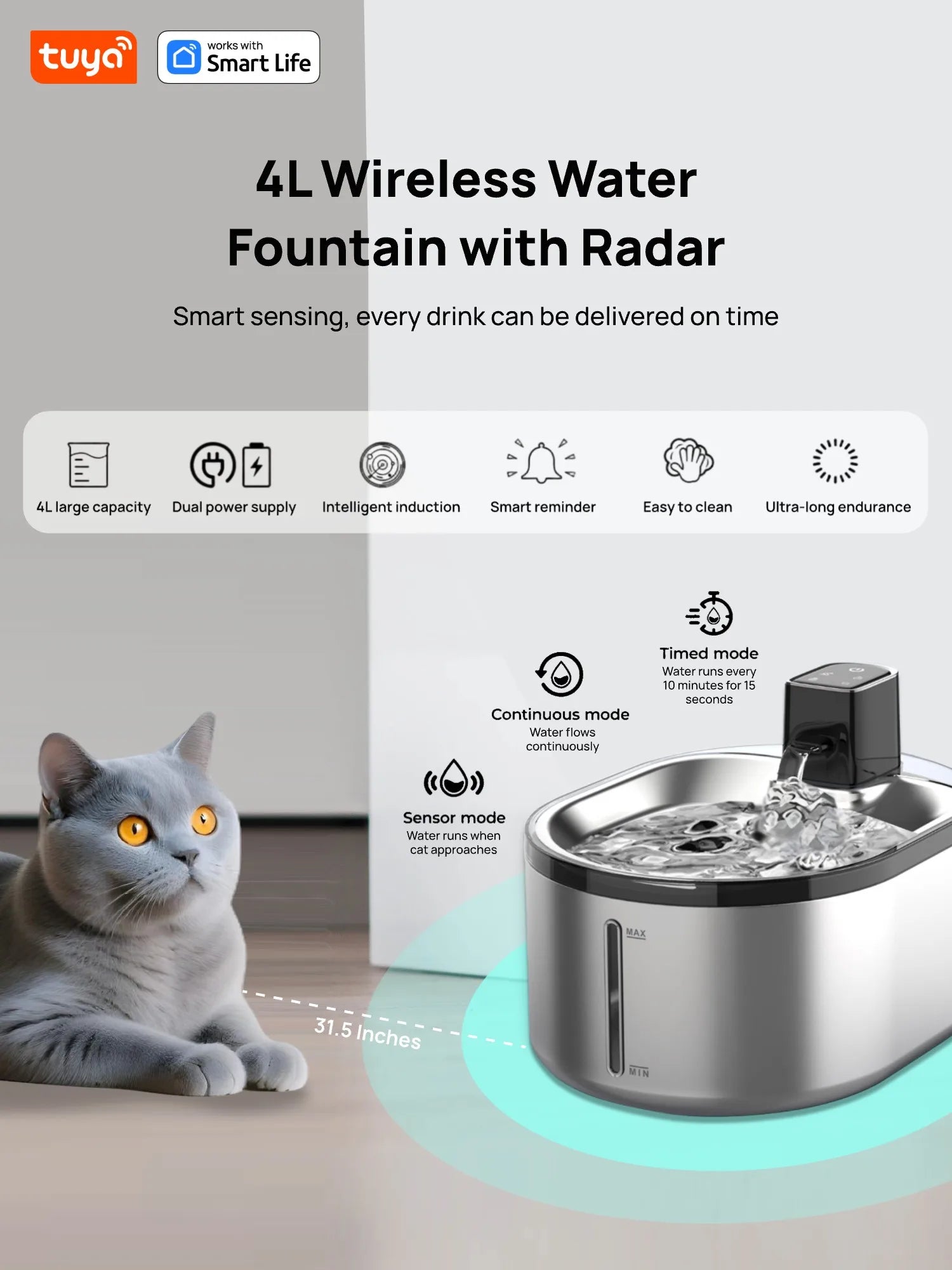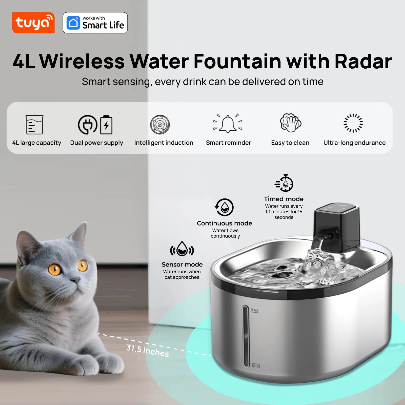 TuyaSmart Cat Fountain Battery Operated,Cat Water FountainSUS304Radar Sensing withMotion Sensor,Ultra Quiet PumpMulti-Filtration
