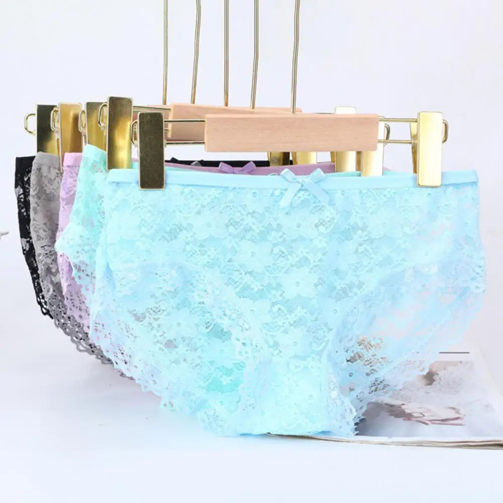 Women Panties Mid Waist Breathable Stretch Hollow Bowknot Soft See-through Lace Sexy Ladies Briefs Underpants Underwear
