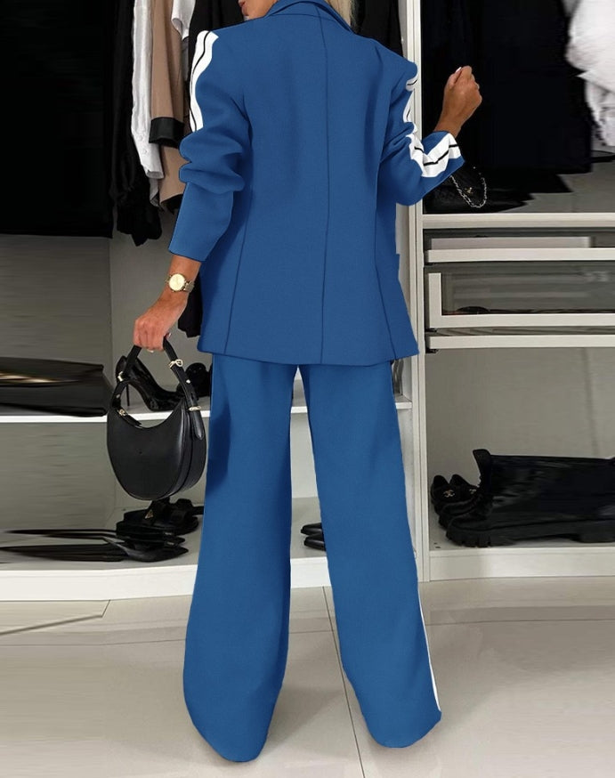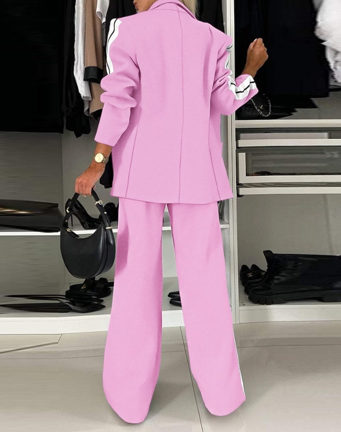 Women's Fashion Suits Autumn Winter Latest 2025 Striped Side Sporty Tape Notched Collar Front Button Blazer Wide-Leg Pants Set