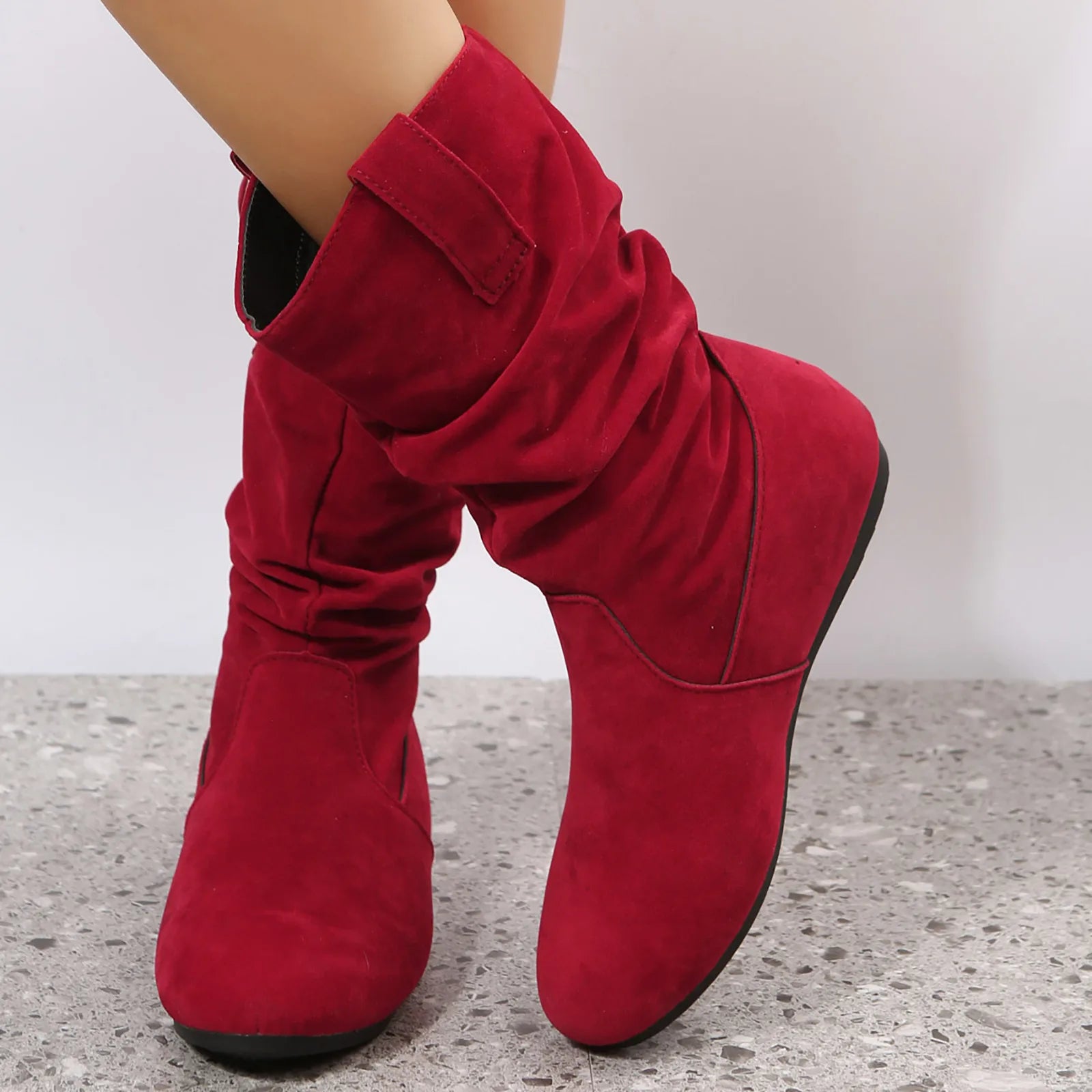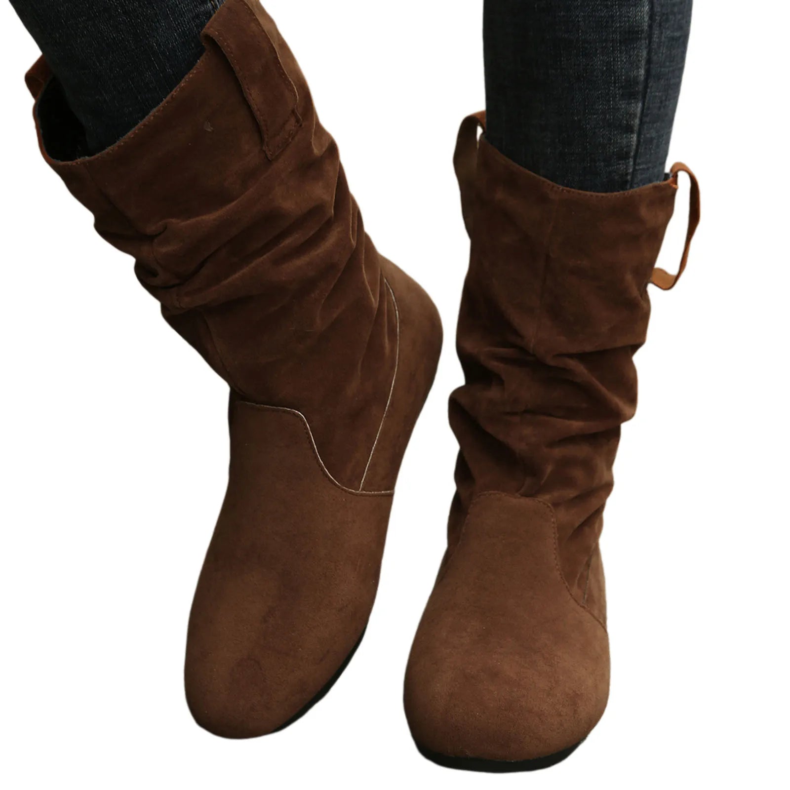 Womens Heel Boots Mid Calf Ladies Fashion Solid Colour Simple Round Toe Suede Flat Bottom Sleeve Cowboy Boots Women with Crosses