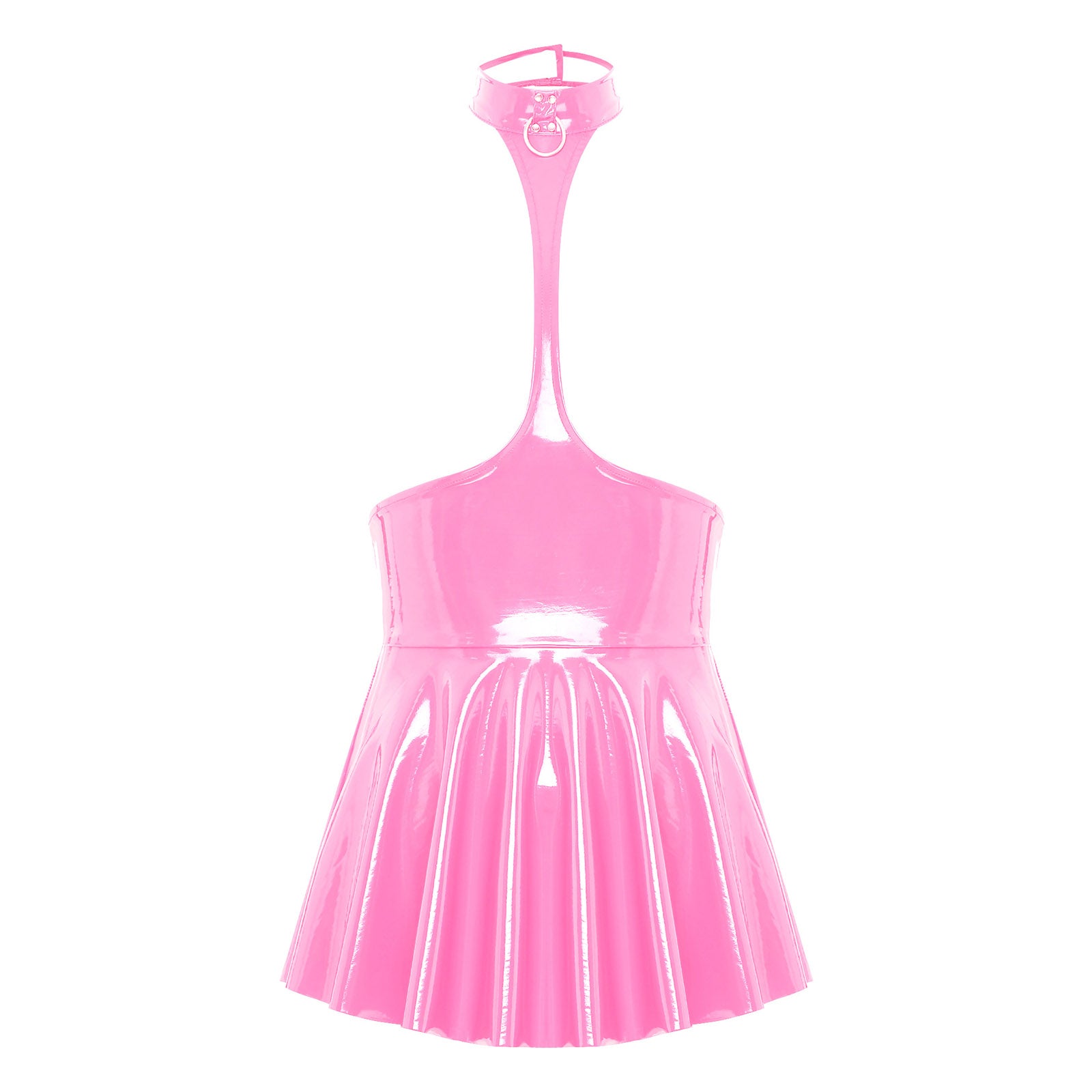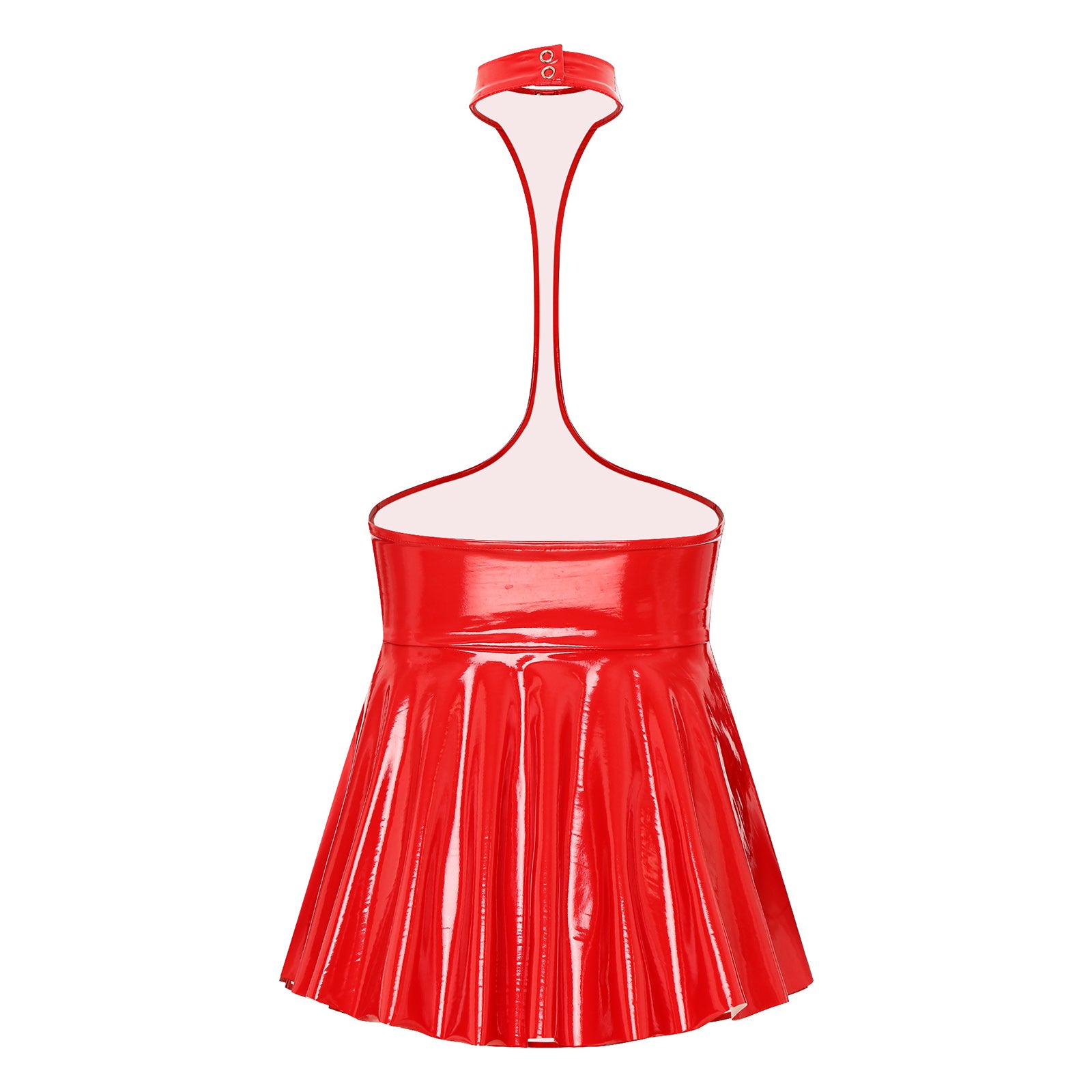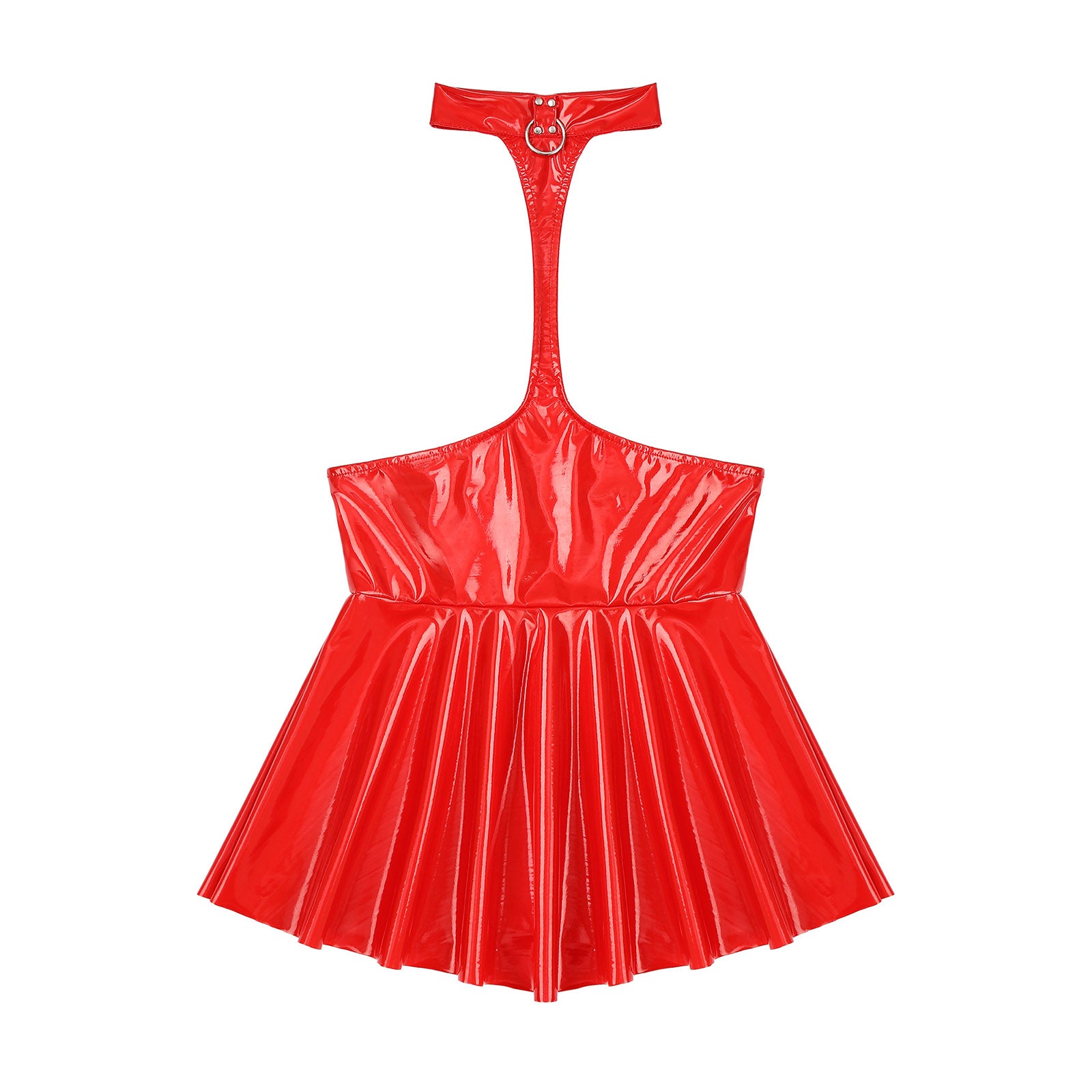 Womens Patent Leather Halter Latex Dress Wet Look Bare Breast Exposing Patent Leather Open Chest Halter Ruffled Latex Dresses
