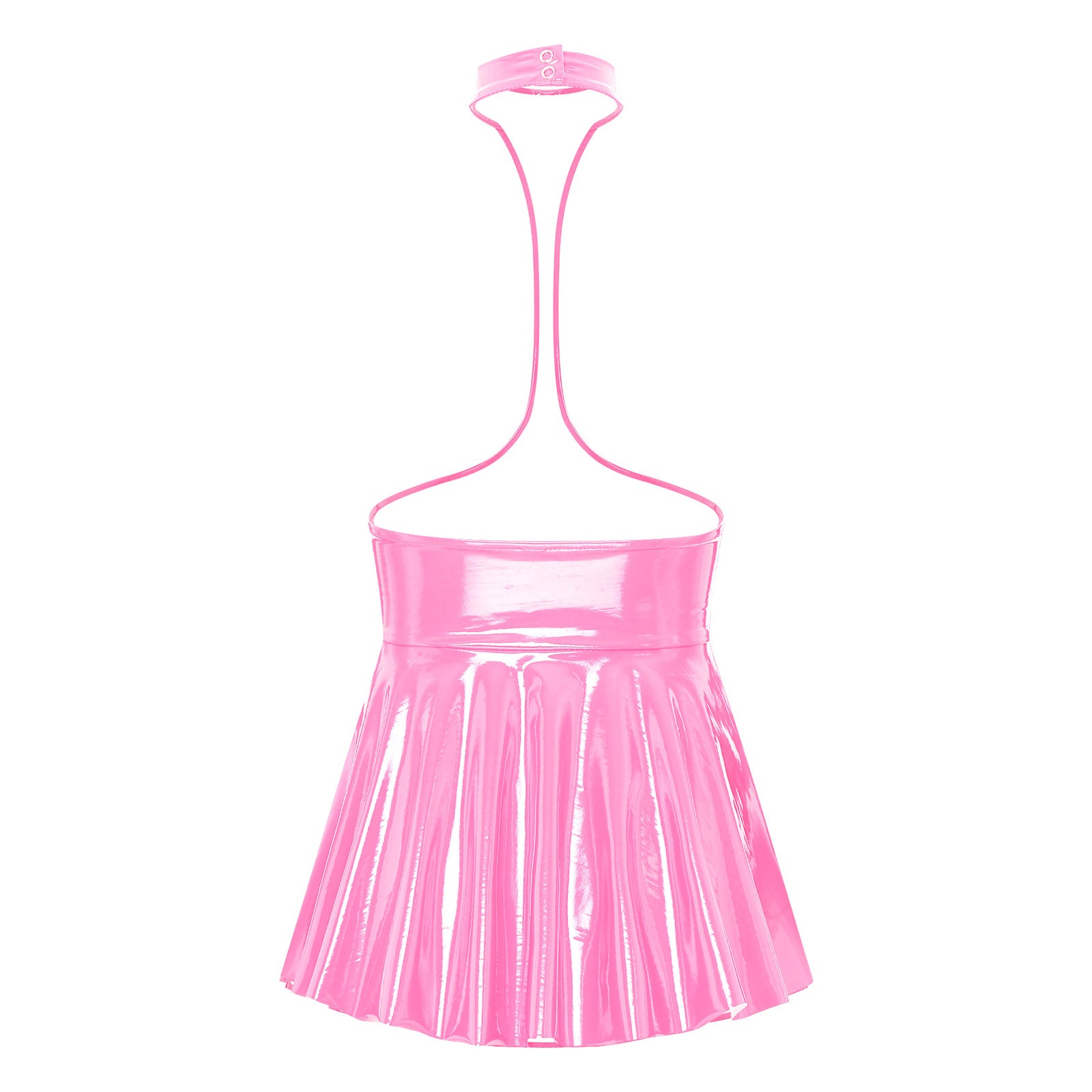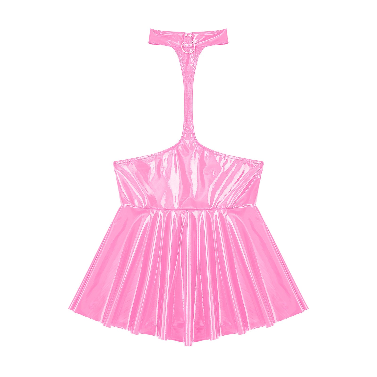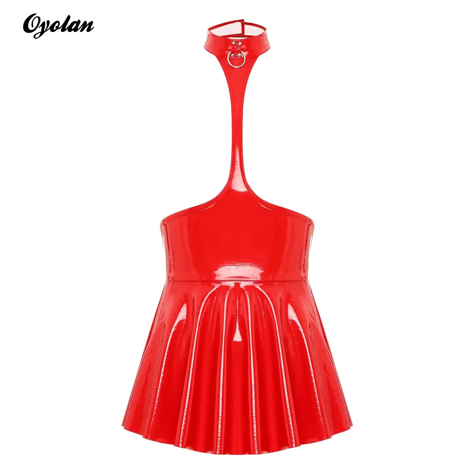 Womens Patent Leather Halter Latex Dress Wet Look Bare Breast Exposing Patent Leather Open Chest Halter Ruffled Latex Dresses