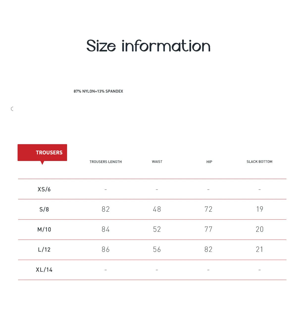 Fabric composition: 87% nylon, 13% spandex (%)